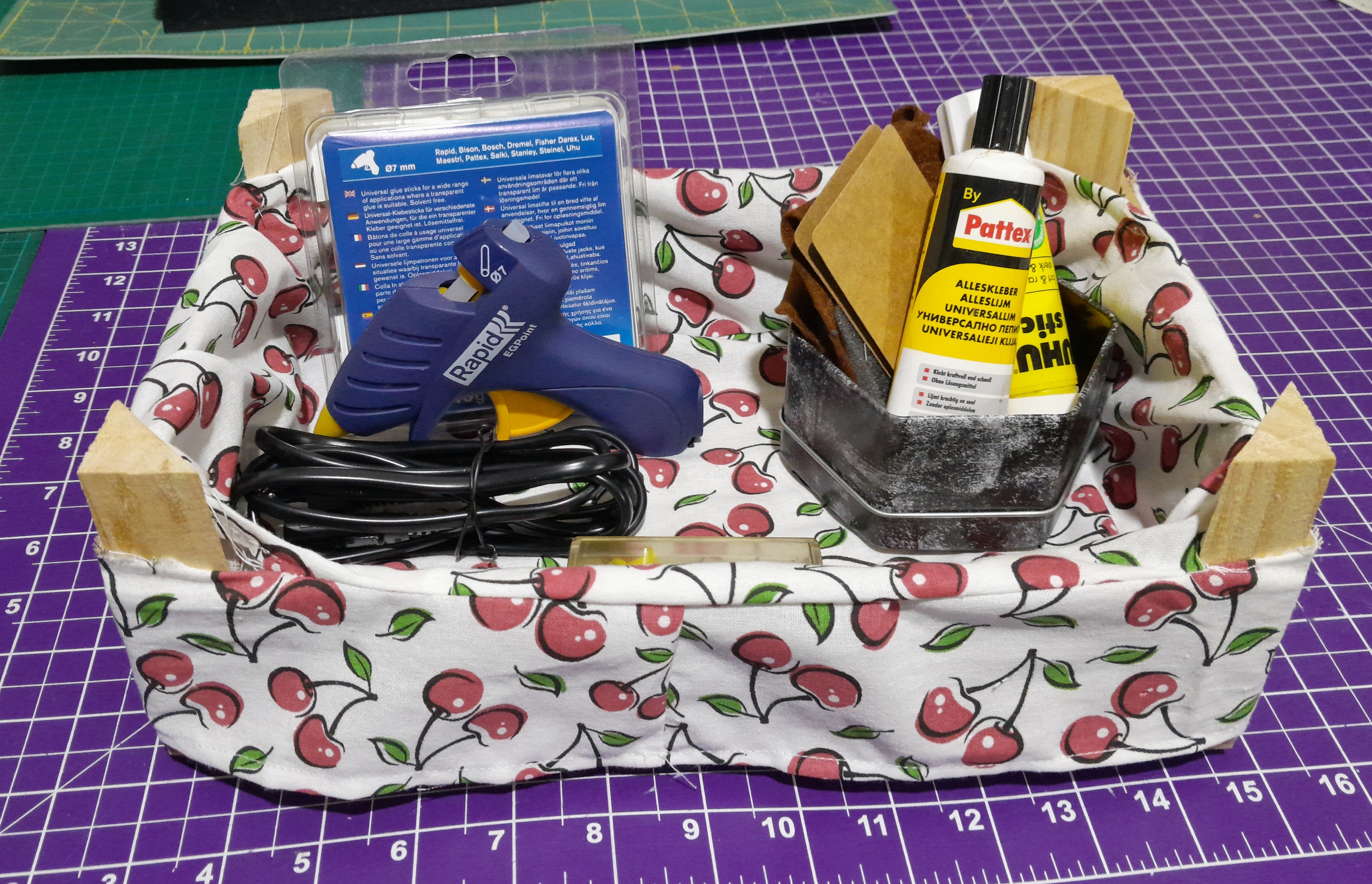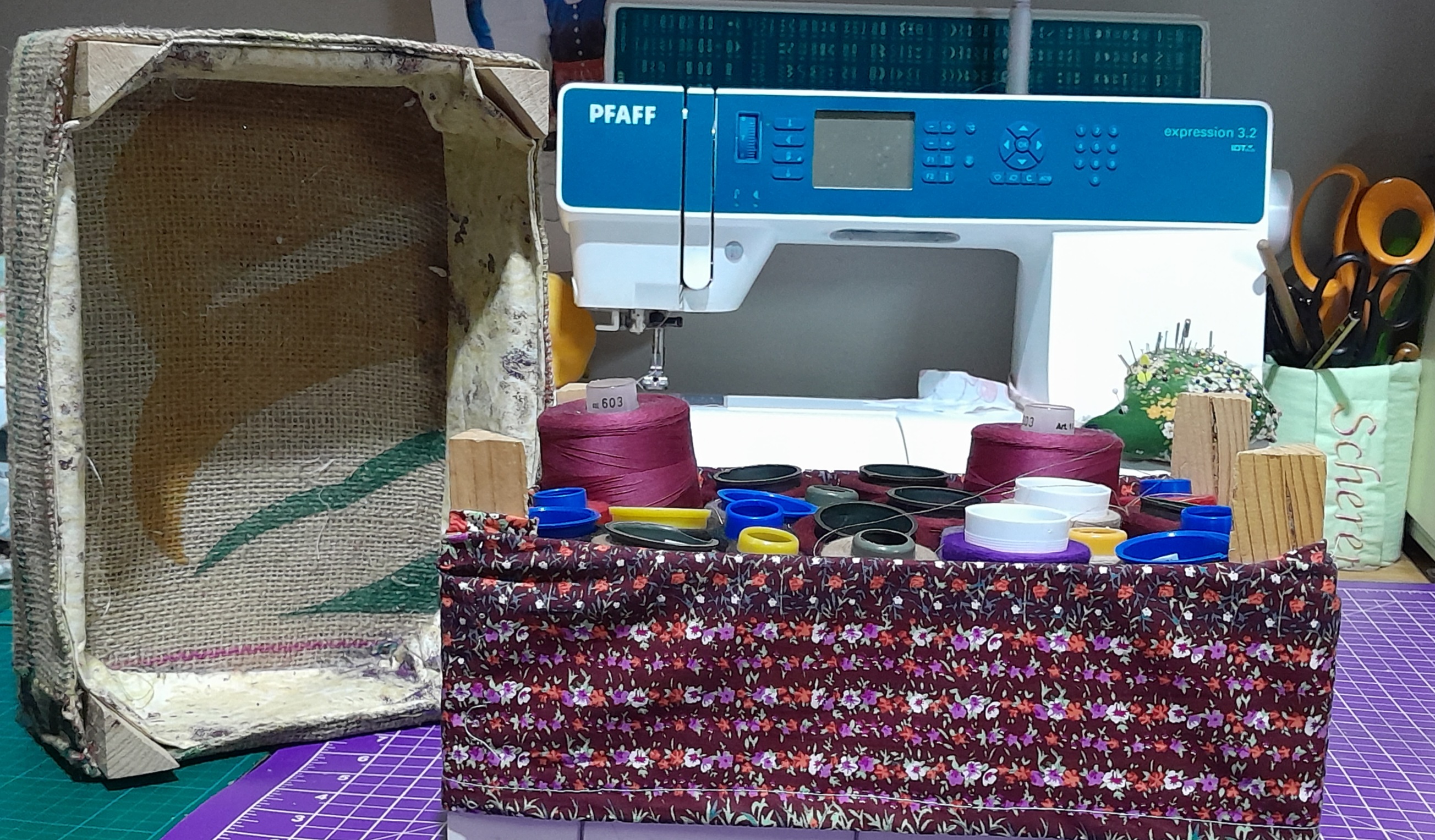 ich werfe nie diese kleinen Kisten in denen Mandarinen verkauft werden weg, denn die kann man sehr schön aufhübschen und als Utensilos verwenden. Hab schon einige im Schrank gefüllt mit Overlockgarn oder anderen Kram. Diese hier wird jetzt das zuhause für meinen Bastelkram den ich so lose im Regal liegen hatte.