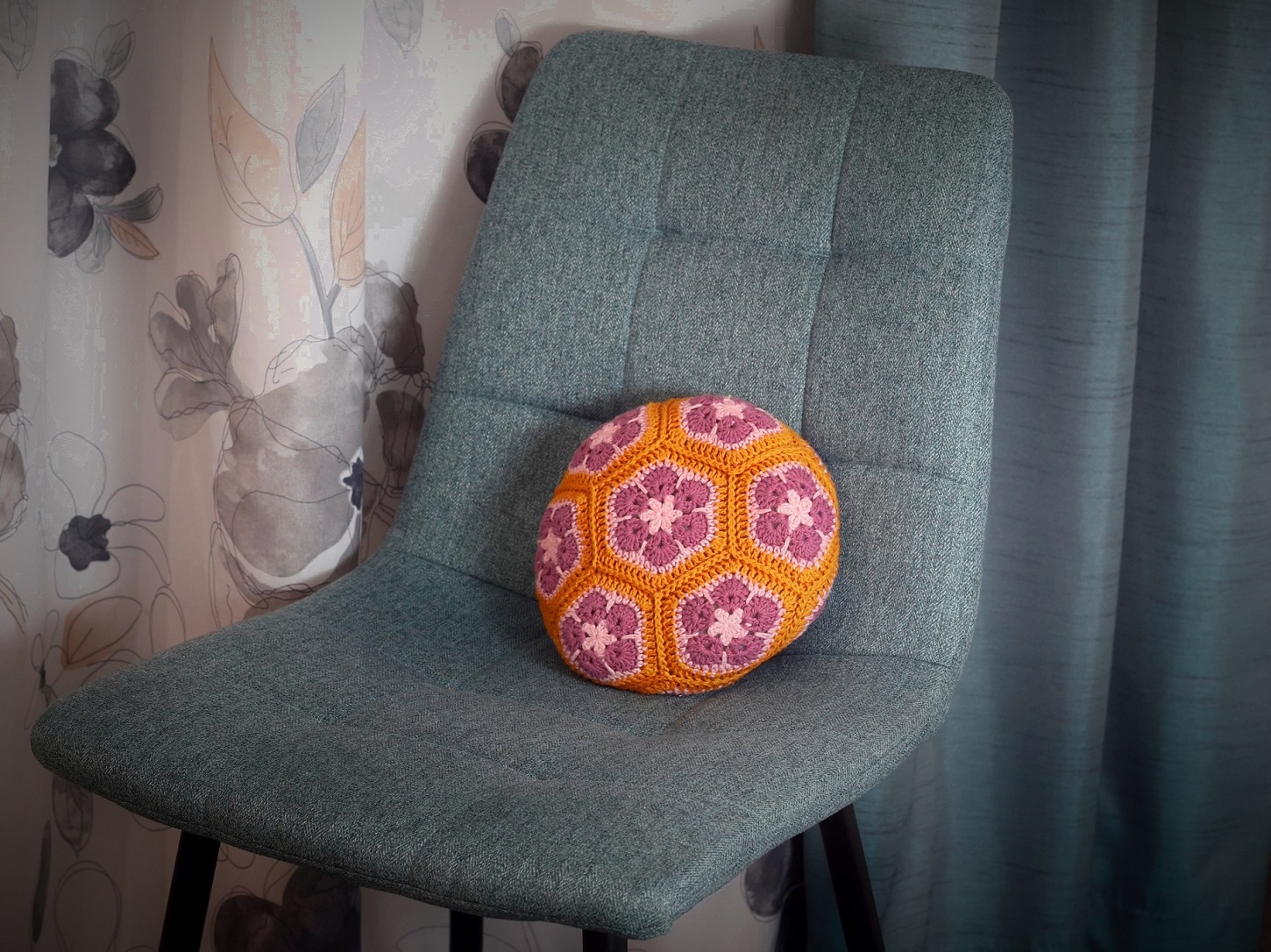 Ein kleines rundes Kissen, gehäkelt mit African Flowers. Zuerst häkelst du die einzelne Blumen. Anschließend werden Sie zu einem Kissen verbunden. Das Kissen kannst du als Wärmekissen oder ein Duftkissen verwenden.