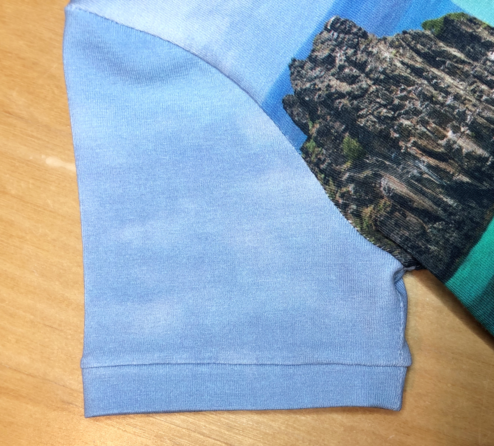 Nur das Halsbündchen ist mir nicht so gut gelungen. Ich hatte nur noch einen ganz schmalen Streifen von dem Stoffpanel, den ich dafür verwenden konnte. Also habe ich so knappkantig genäht, dass die Naht am Ende nicht überall geschlossen war. Musste ich vorne nochmal nachnähen. Deshalb ist das Bündchen nicht überall gleich breit. Aber meinen Enkel wird das wohl nicht stören.
