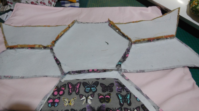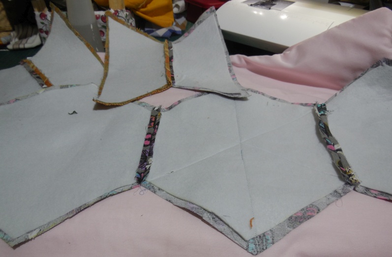 Schmalstelle zusammen nähen und an das eine äußere Hexa annähen, die