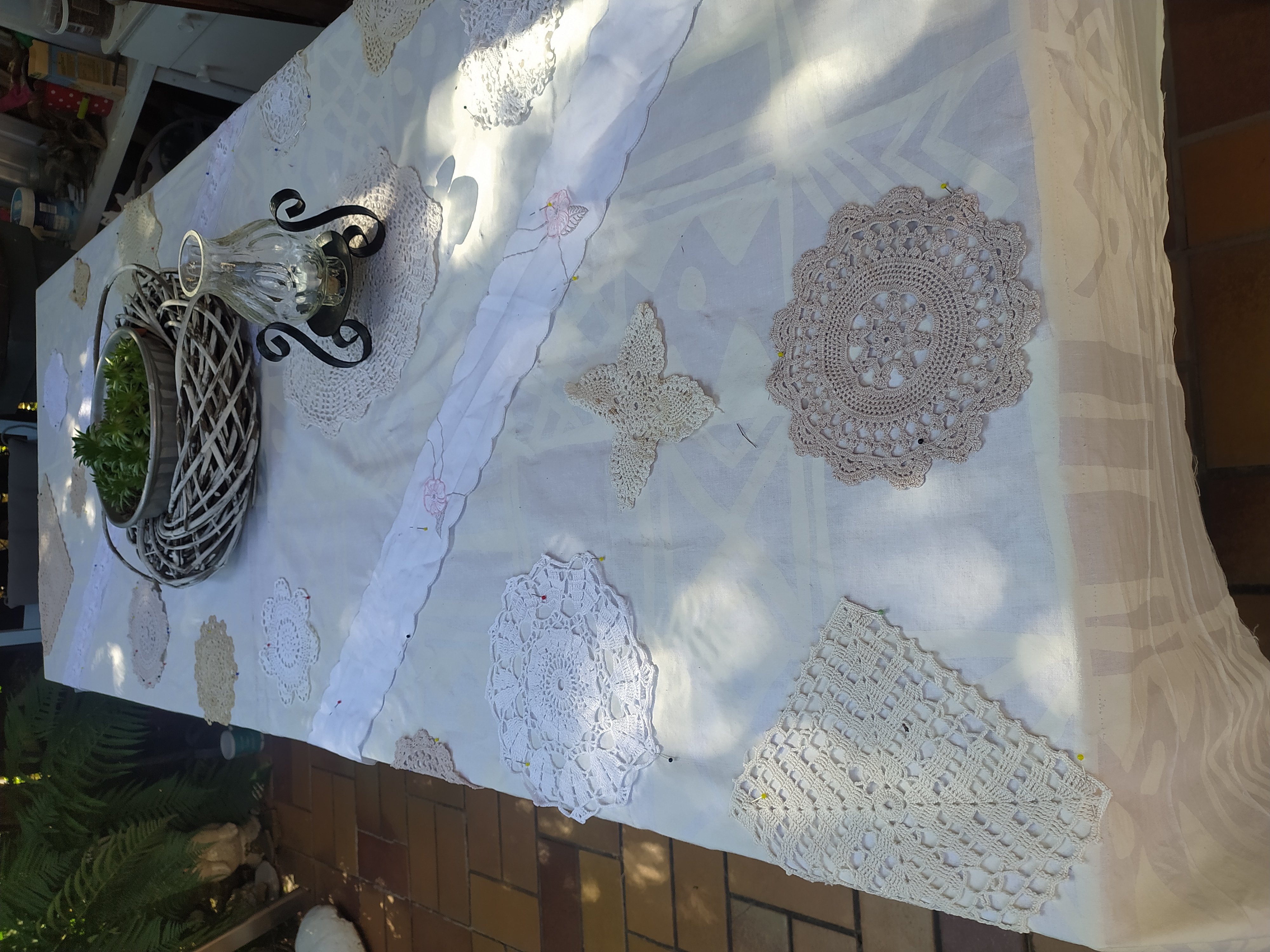 Heute habe ich gar keine Tischdecken mehr, aber früher hatten wir einen riesigen Tisch, für den es kaum passende Decken gab, und wenn, dann fand ich sie hässlich. Also habe ich mir Baumwolstoffe gekauft und gesäumt und fertig war die Tischdecke. Als wir umzogen, kam der Tisch nicht mehr mit, und Tischdecken brauchte ich auch nicht mehr. Eine Nachbarin hat alle meine Tischdecken genommen und daraus Kinderkleider fürs Sozialkaufhaus genäht, weil es so schön bunte Baumwollstoffe waren.