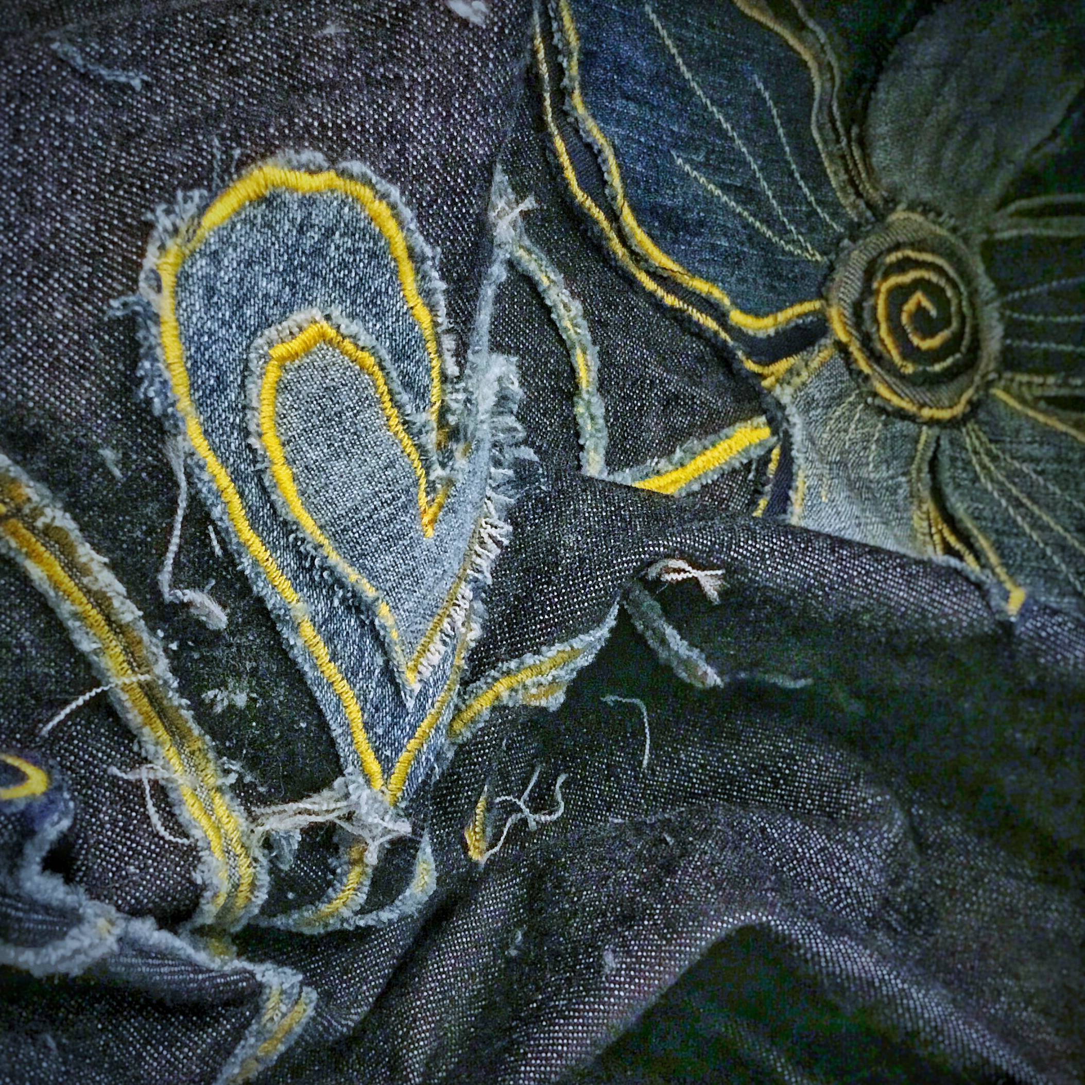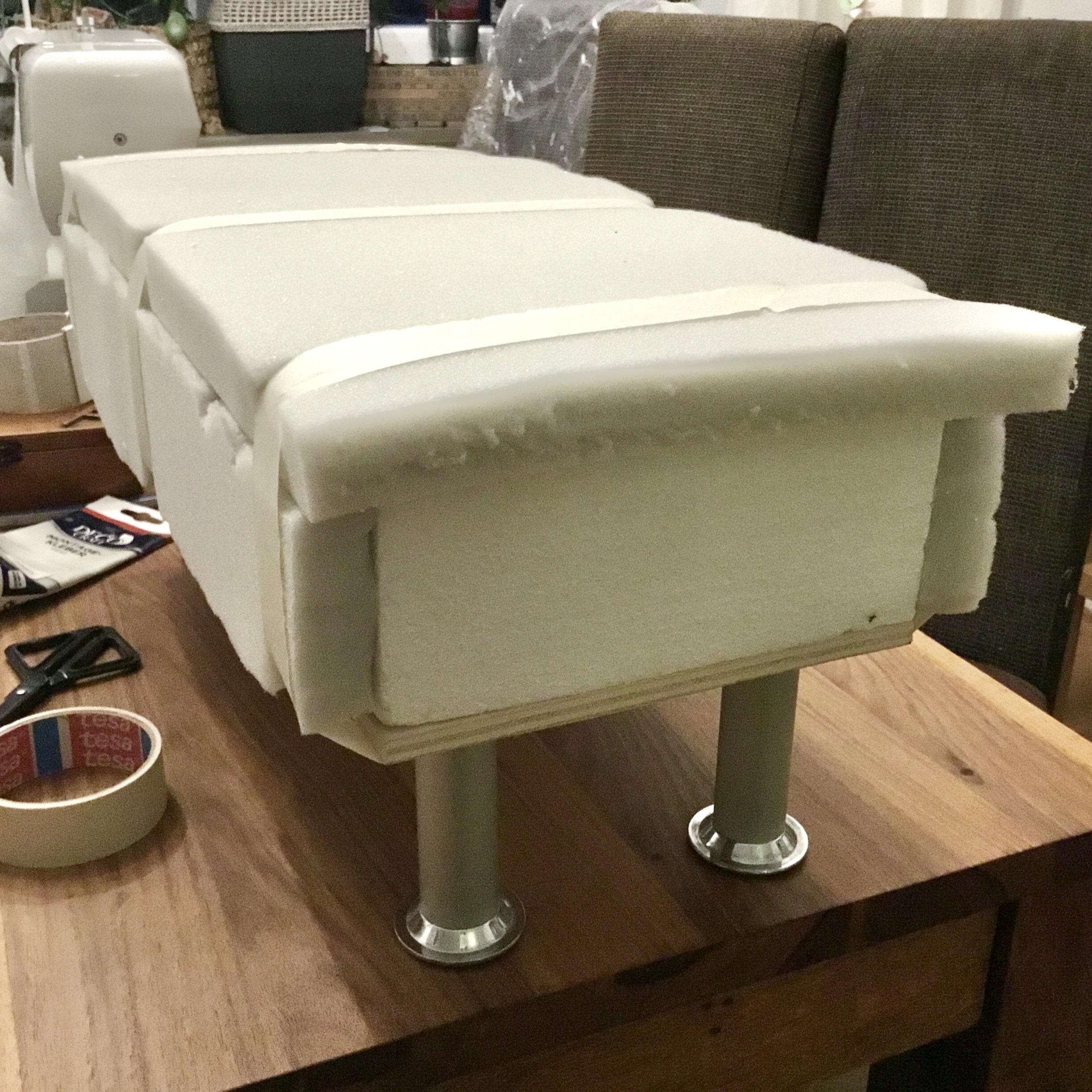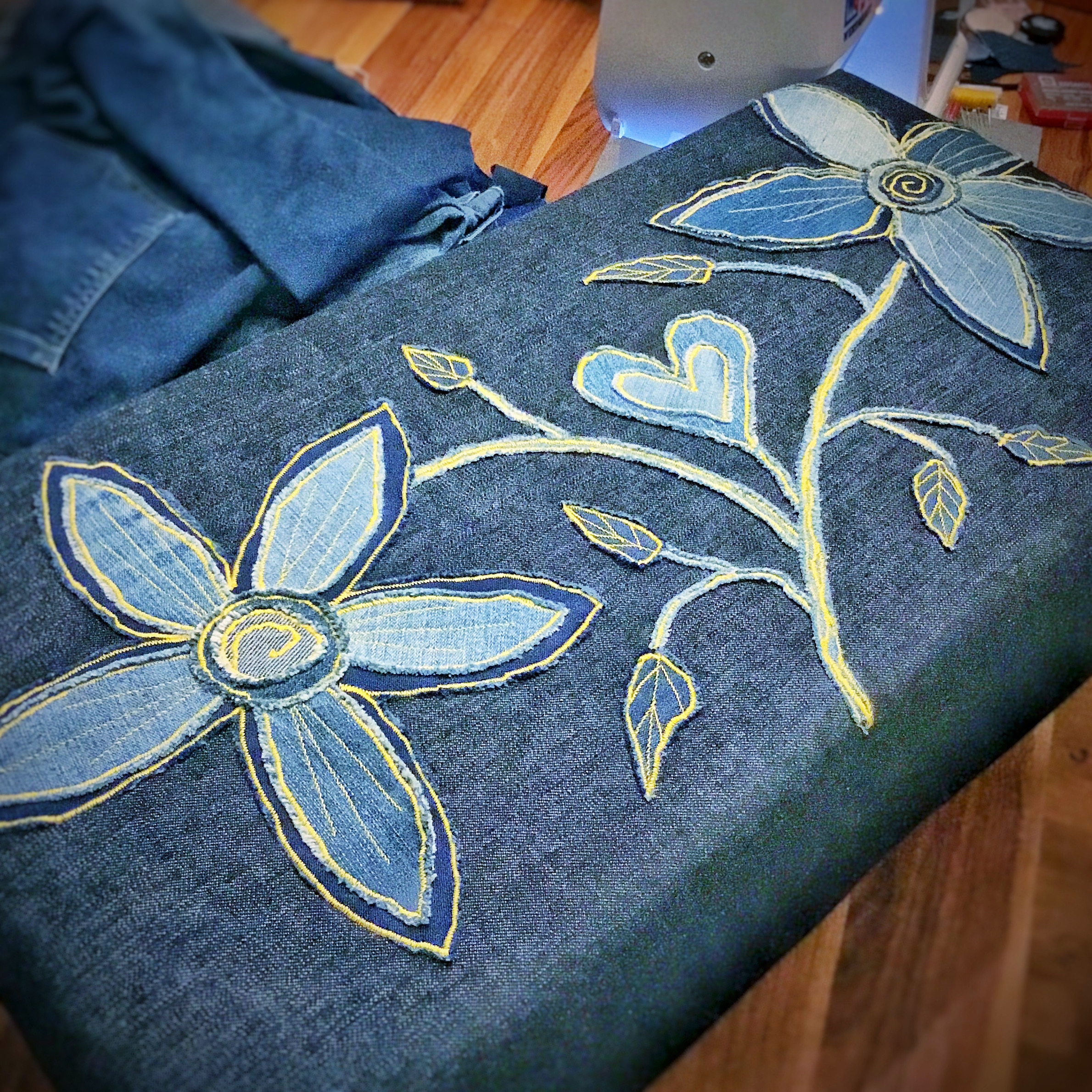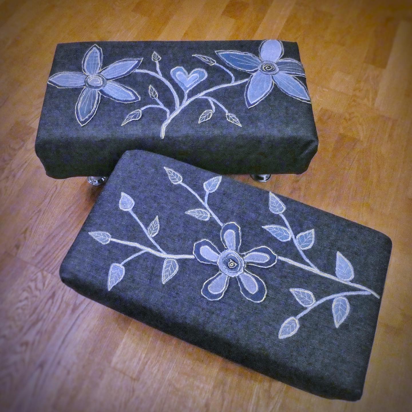 Die Fußhocker bestehen aus Sperrholz-Resten, alten Sofafüßen und Überbleibseln von Isolierplatten aus Styropor. Der Bezug ist allerdings aus neuem Jeansstoff, die Applikationen sind wieder aus alten Jeans. Der Schaumstoff war ebenfalls neu, darüber habe ich ein Vlies gespannt (leider nicht fotografiert), das vorher Verpackungsmaterial war. Also eine bunte Mischung…