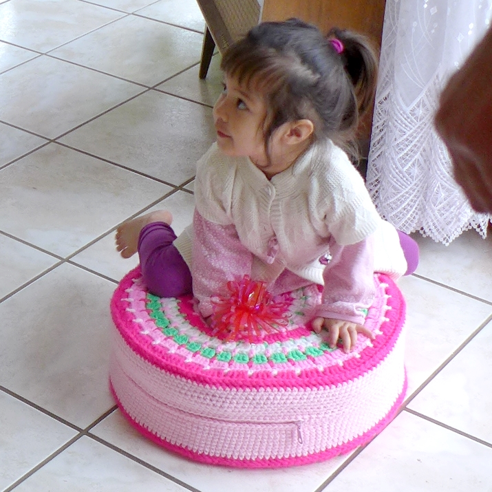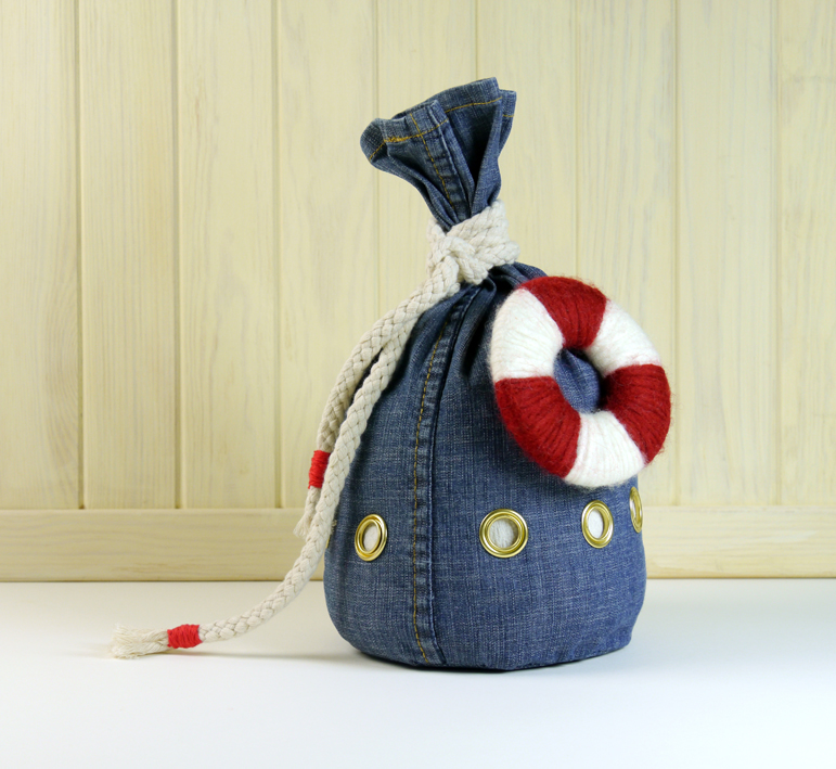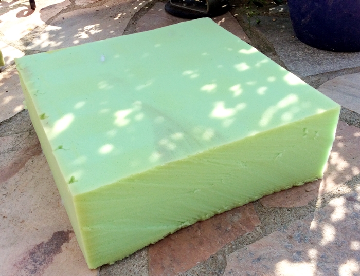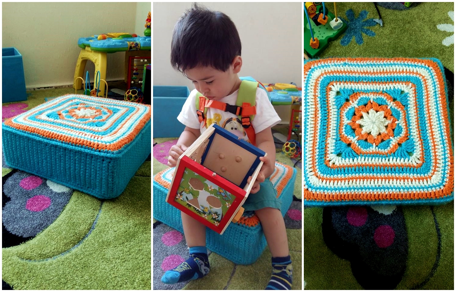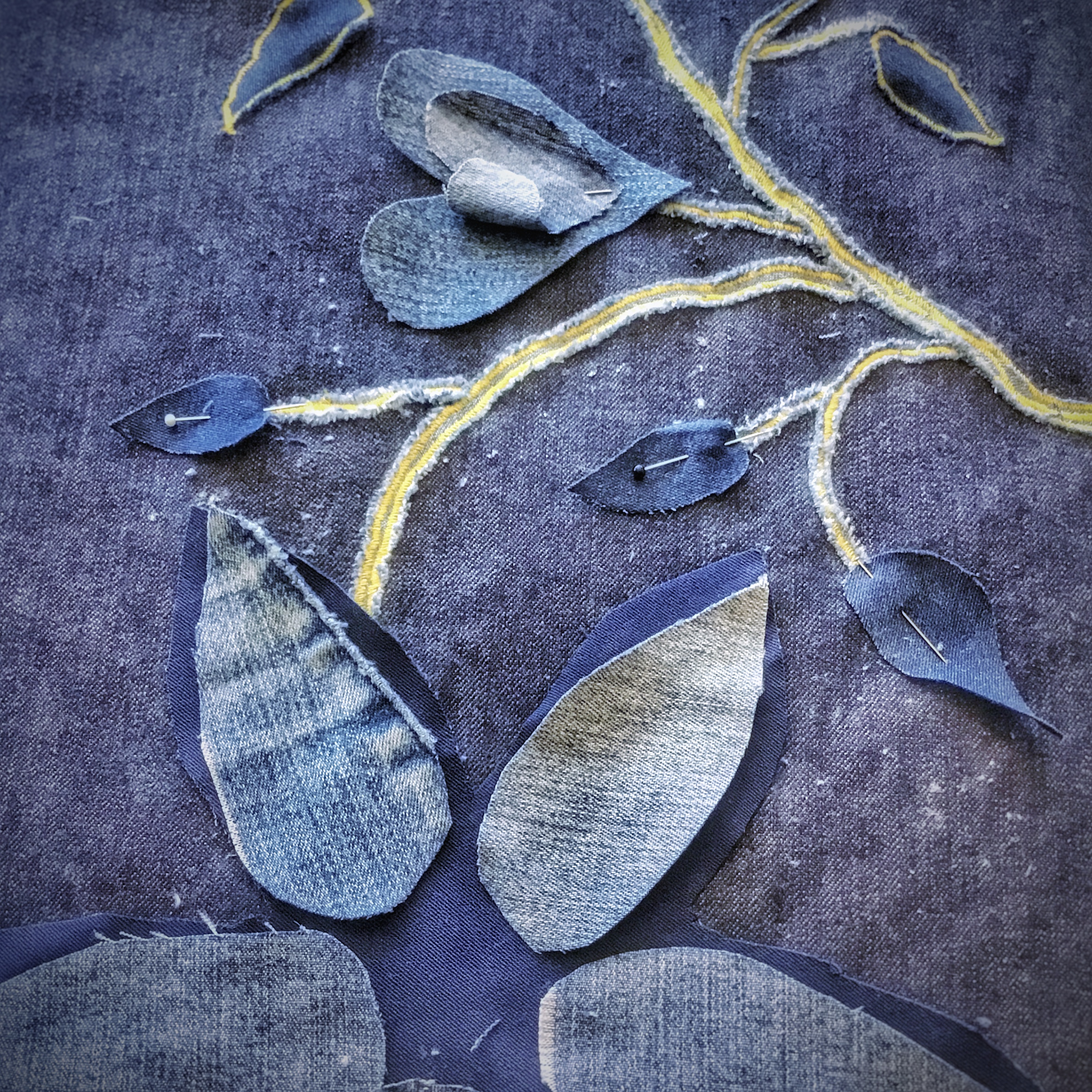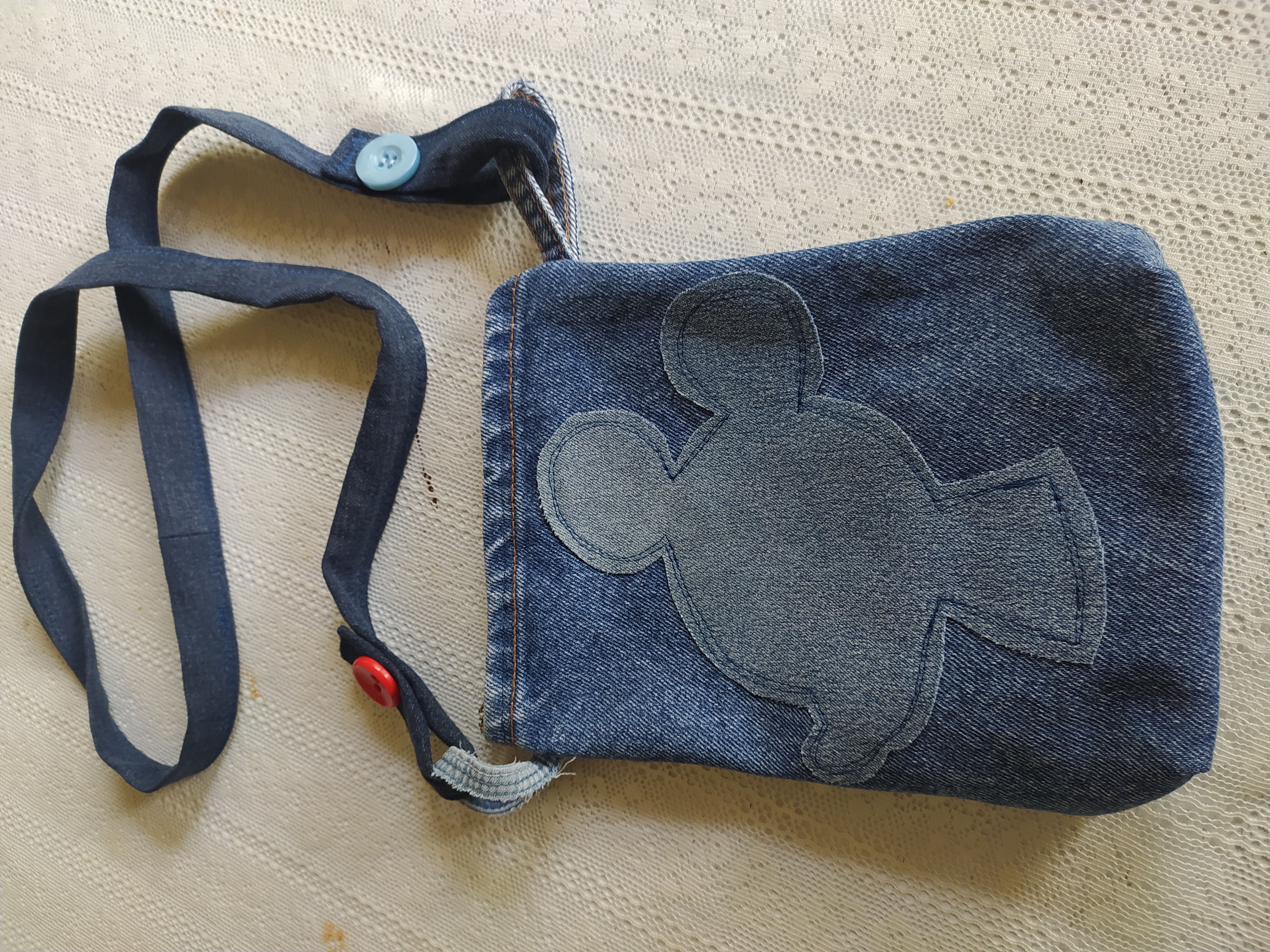 Die Fußhocker bestehen aus Sperrholz-Resten, alten Sofafüßen und Überbleibseln von Isolierplatten aus Styropor. Der Bezug ist allerdings aus neuem Jeansstoff, die Applikationen sind wieder aus alten Jeans. Der Schaumstoff war ebenfalls neu, darüber habe ich ein Vlies gespannt (leider nicht fotografiert), das vorher Verpackungsmaterial war. Also eine bunte Mischung…