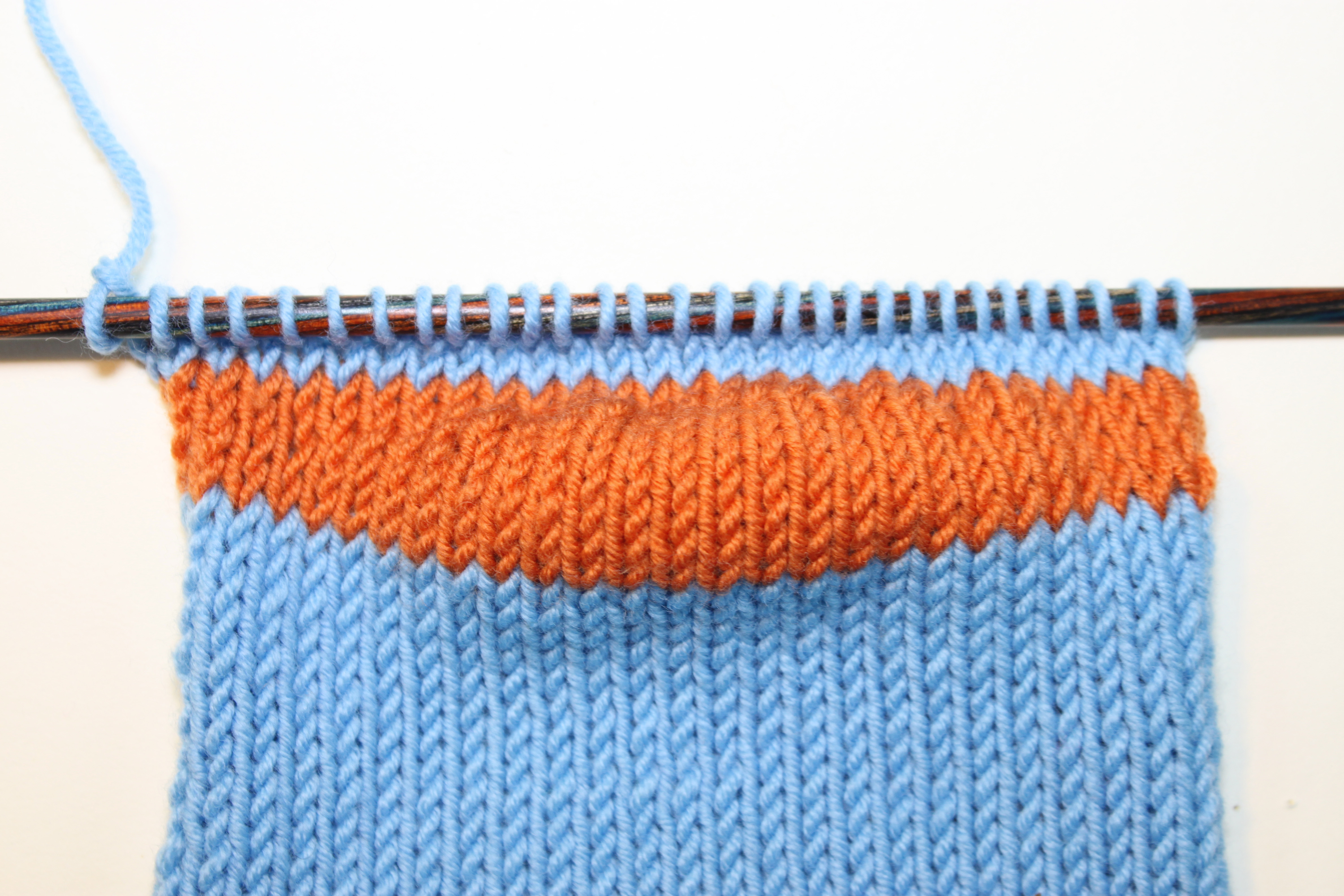 PS. Ich hänge mal ein Bild an, was eigentlich bei den verkürzten Reihen passiert. Der orangefarbene Part ist mit verkürzten Reihen gestrickt (auch wen ich eine andere Technik für die Wendemaschen verwende.)