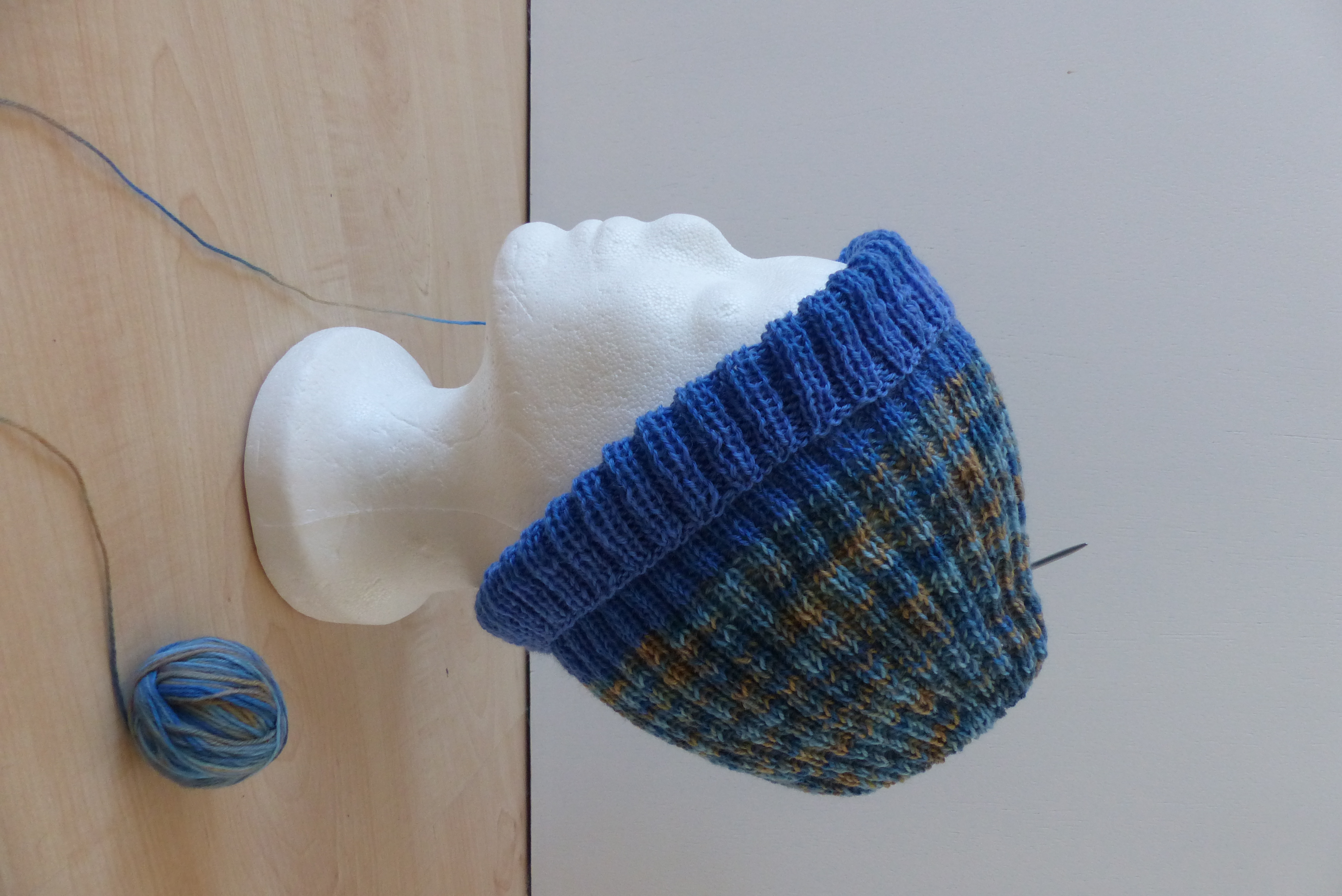 Ich stricke aus lauter geschenkten Resten von Sockenwolle eine Mütze für mich. Gedacht für den ersten Spaziergang morgens im Garten, den ersten Kaffee auf der Terrasse im Urlaub.