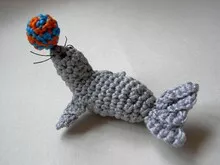 Und zum Schluss noch eine süße Minirobbe, die einen bunten Ball auf der Nase balanciert.. Häkle sie mit weißem oder grauem Baumwollgarn. Und für den Ball genügt wieder ein winziger bunter Rest.