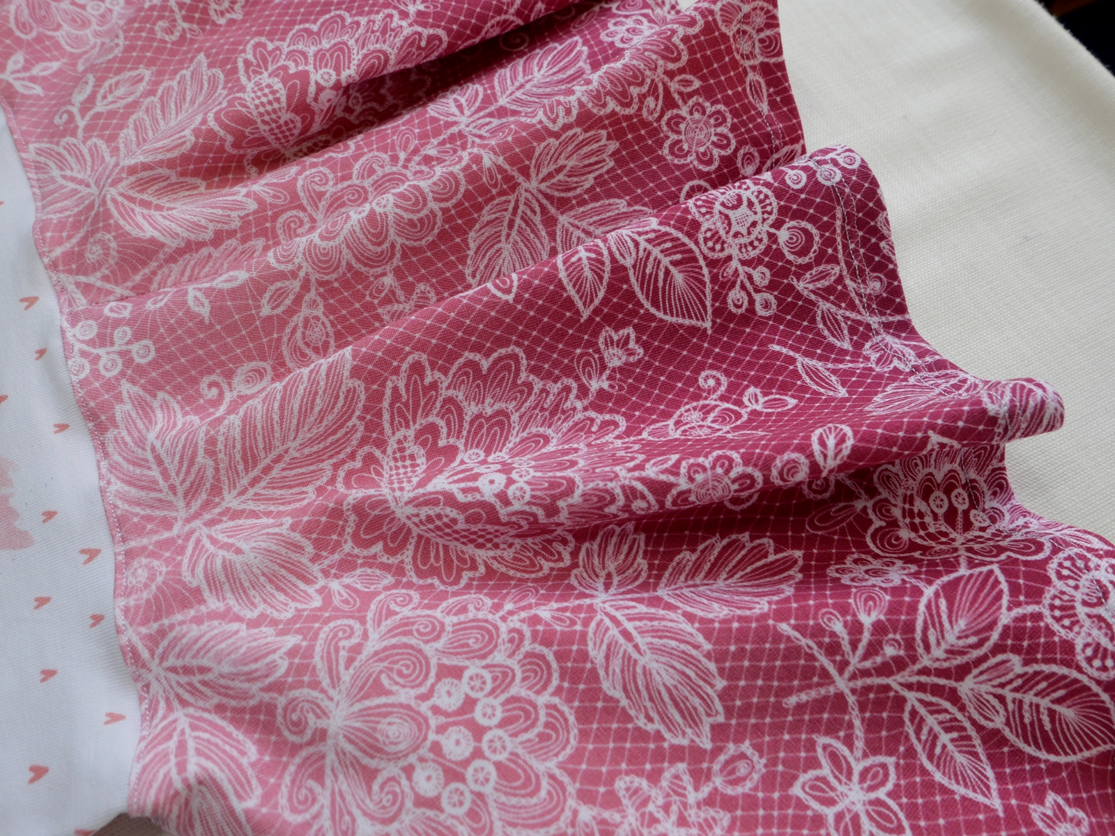 Es war gar nicht so einfach, einen Stoff zu finden, der zu dem Panel passt. Einfarbig wäre mir zu wenig verspielt gewesen. Zum Glück fand sich ein Baumwolljersey mit Farbverlauf in meiner Vorratskiste. Den Stoffrest hatte ich vor Jahren (da konnte ich noch gar nicht nähen) mal bei Ebay gesehen und mich in ihn verliebt. Ich mag ja Spitze und Farbverläufe, deshalb musste ich ihn haben. Irgendwann würde schon die Zeit für ihn kommen :-)