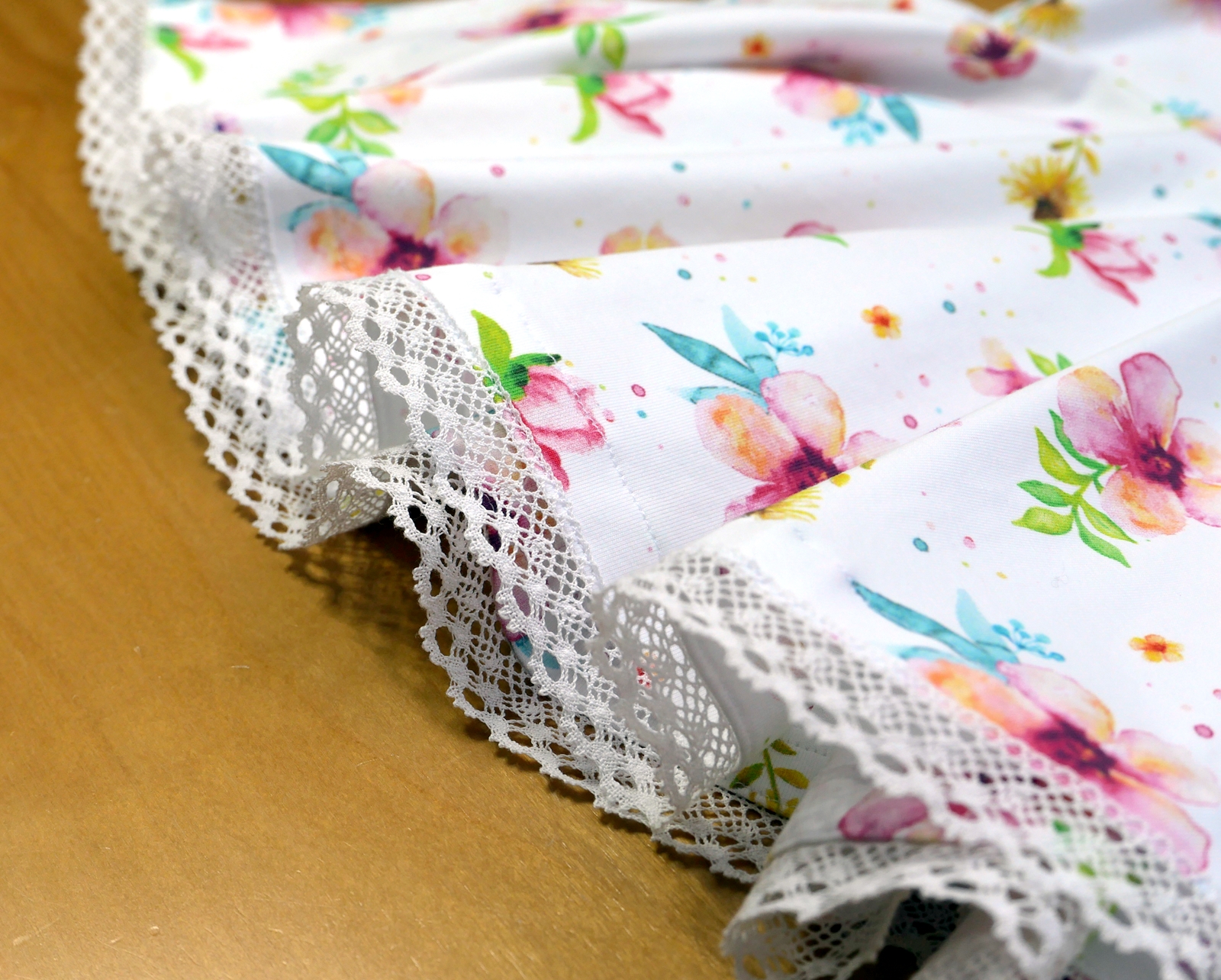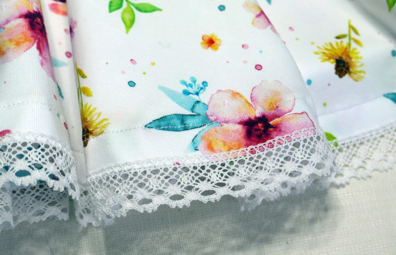 wenn man Stoffe shopt, wird man auch von Wünschen und Vorfreuden geleitet. Jetzt kommt der Frühling und da begeistern mich gerade Stoffe, die das Frühlingsgefühl in mir verstärken. So fiel mein Blick auf diesen zauberhaften weichen Stoff aus Baumwolljersey, aus dem ich nun ein Drehkleid für die jüngste Enkelin genäht habe. Ich habe mich gleich in die pastellfarbenen Blüten, die auf weißem Grund wie hingestreut daliegen, verliebt. Frühling auf dem Stoff, deshalb sollte es ein beschwingtes Kleid, eben ein Drehkleid werden.