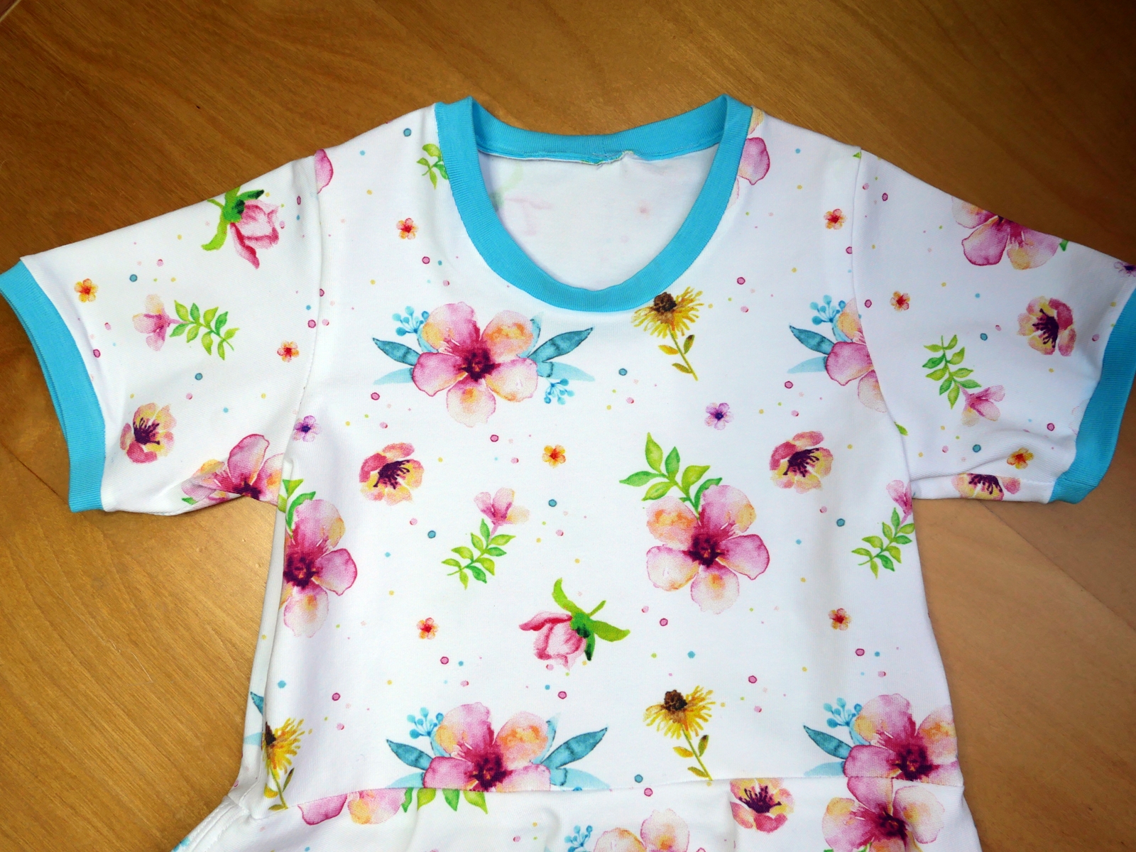 Das Halsbündchen und die Arme bekamen einen Abschluss aus türkisfarbenem Baumwolljersey.