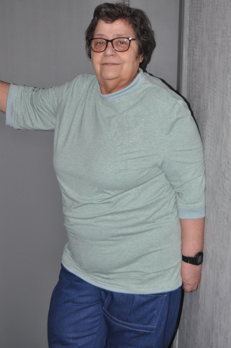 so und nun die Shirts angezogen, und die Jeans auch, das ist mein altbewährter Schnitt, diesmal setzte ich auf die linke Seite eine Tasche m mit auf, beides ist wieder eine Maßarbeit; Shirt wie Hose