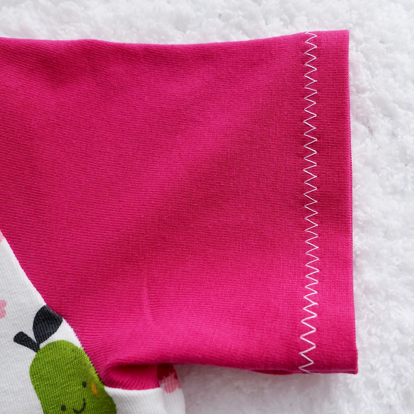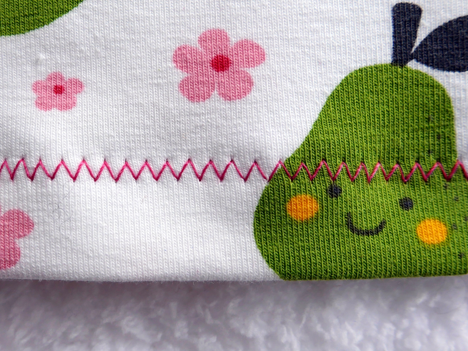 Säume an den Ärmeln und unten mit einer Kontrastfarbe im Zickzackstich umgenäht habe. So haben die Stoffenden einen schönen Zierabschluss, deren Farben sich im Kleidchen wiederfinden.