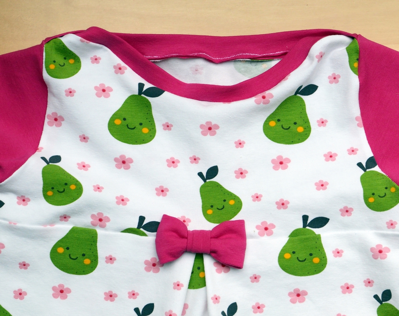 Schleife aus dem pinkfarbenen Baumwolljerseystoff genäht und sie über der aufspringenden Kellerfalte fest angenäht.