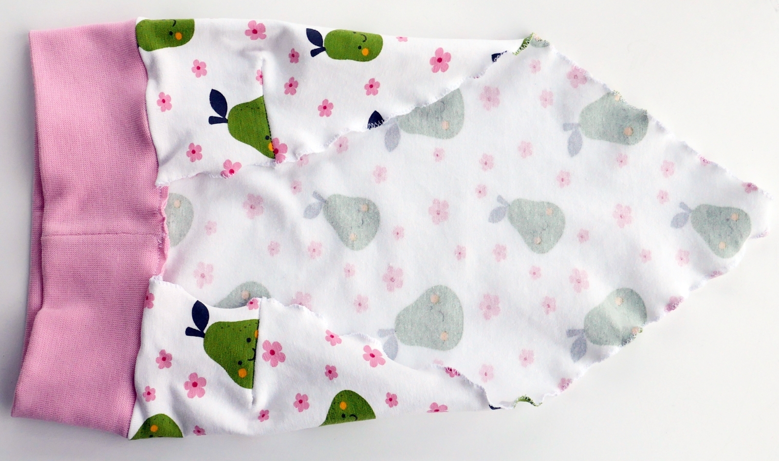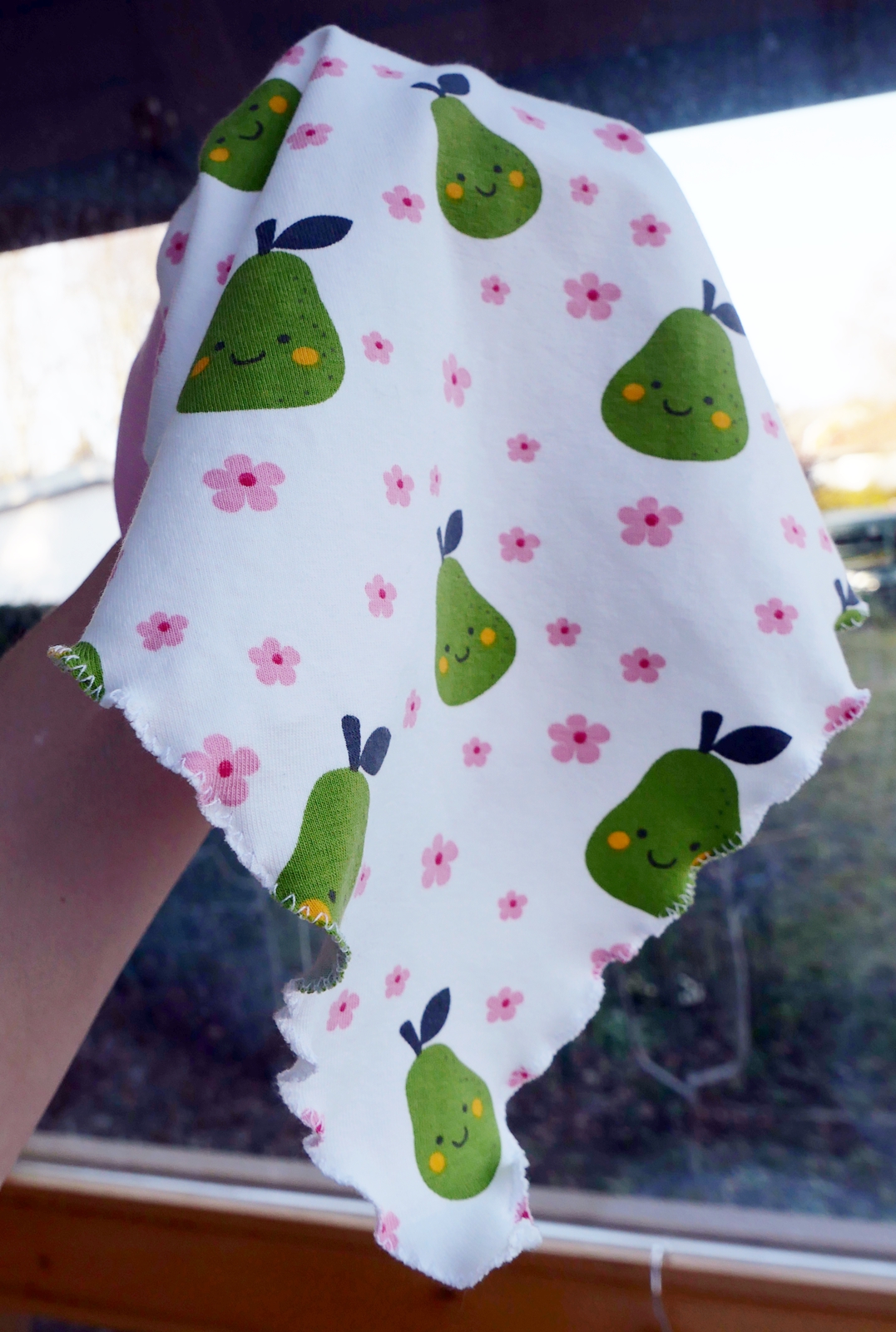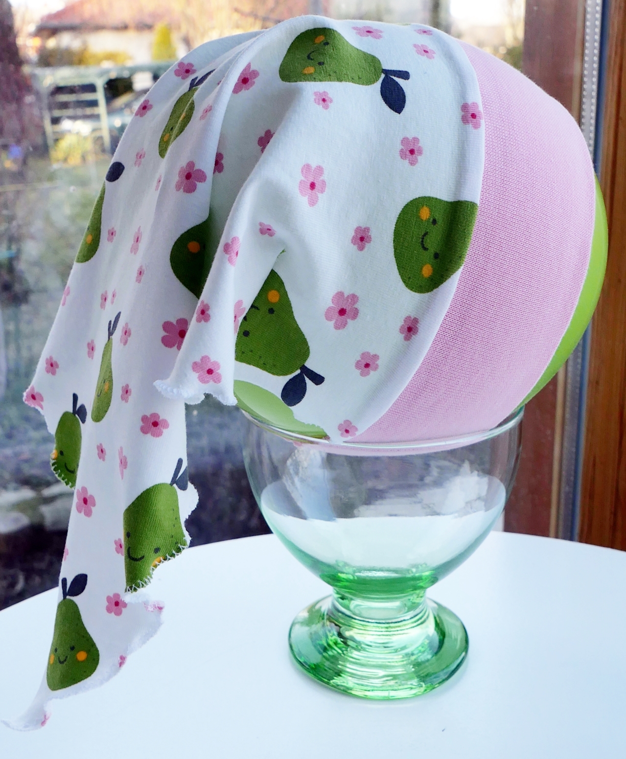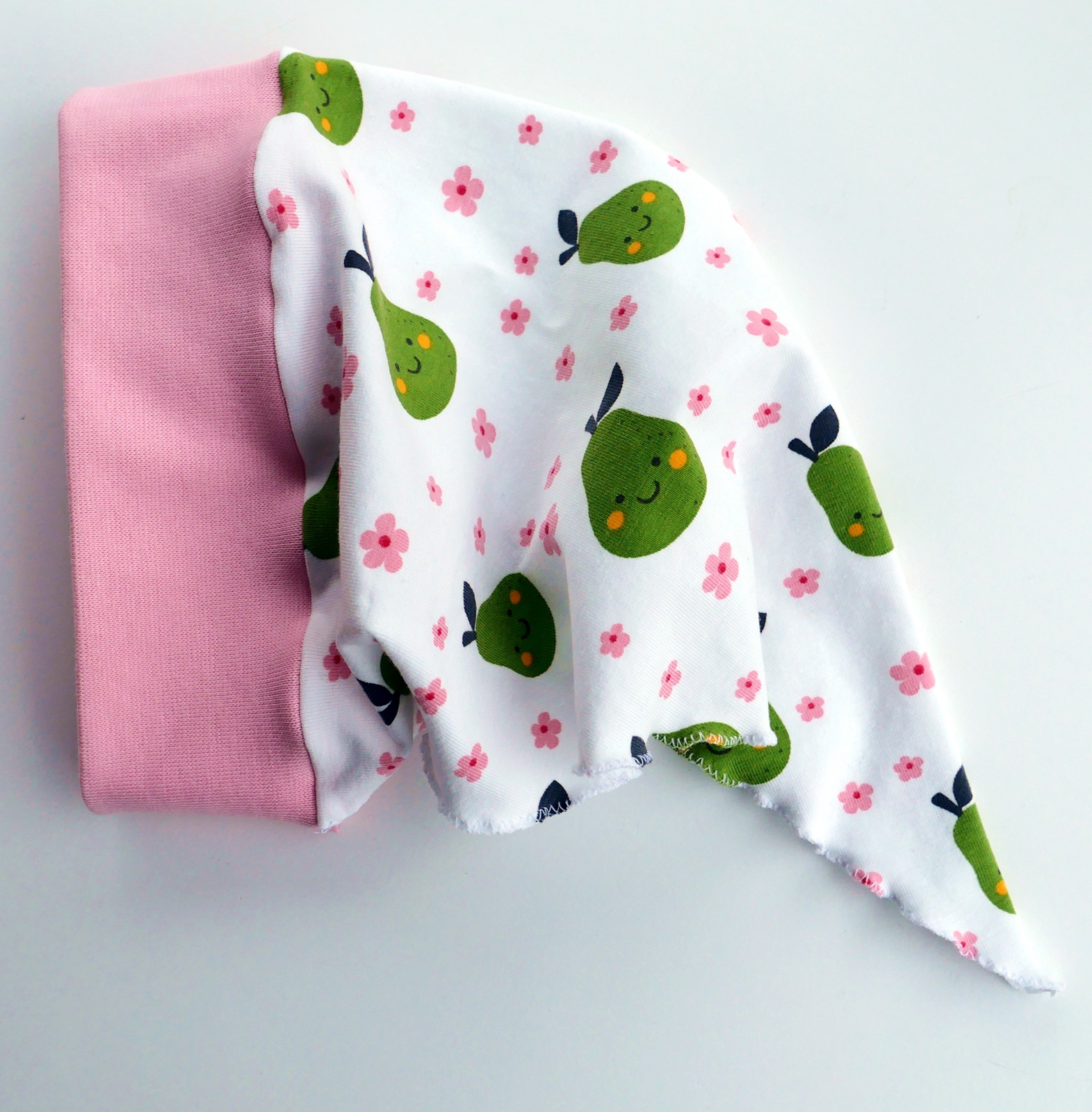 Kopftuch genäht. Die Materialien waren hier wieder mein Baumwolljersey mit den kleinen Birnchen und ein Stück Rosa Bündchenware.