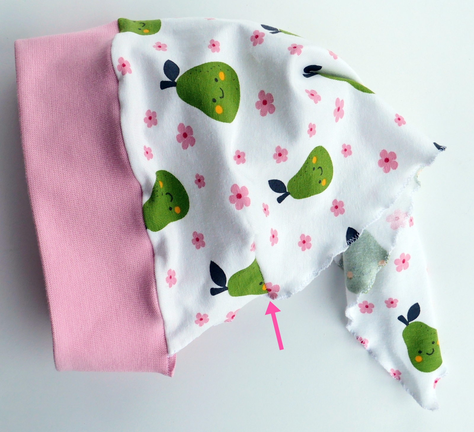 An den Seiten gibt es rechts und links kleine Abnäher (siehe Pfeil), so dass das Kopftuch beim Tragen schön am Kopf anliegt.