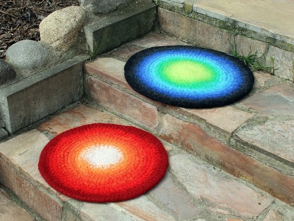 Auch das braucht man besonders im Frühjahr: ein Sitzkissen! Es wird aus Filzwollresten gehäkelt. Das Filzen übernimmt die Waschmaschine. Man kann einrollen und überall hin mitnehmen. Das dicke Filz schützt zuverlässig vor Kälte von unten, wenn man irgendwo sitzt.
