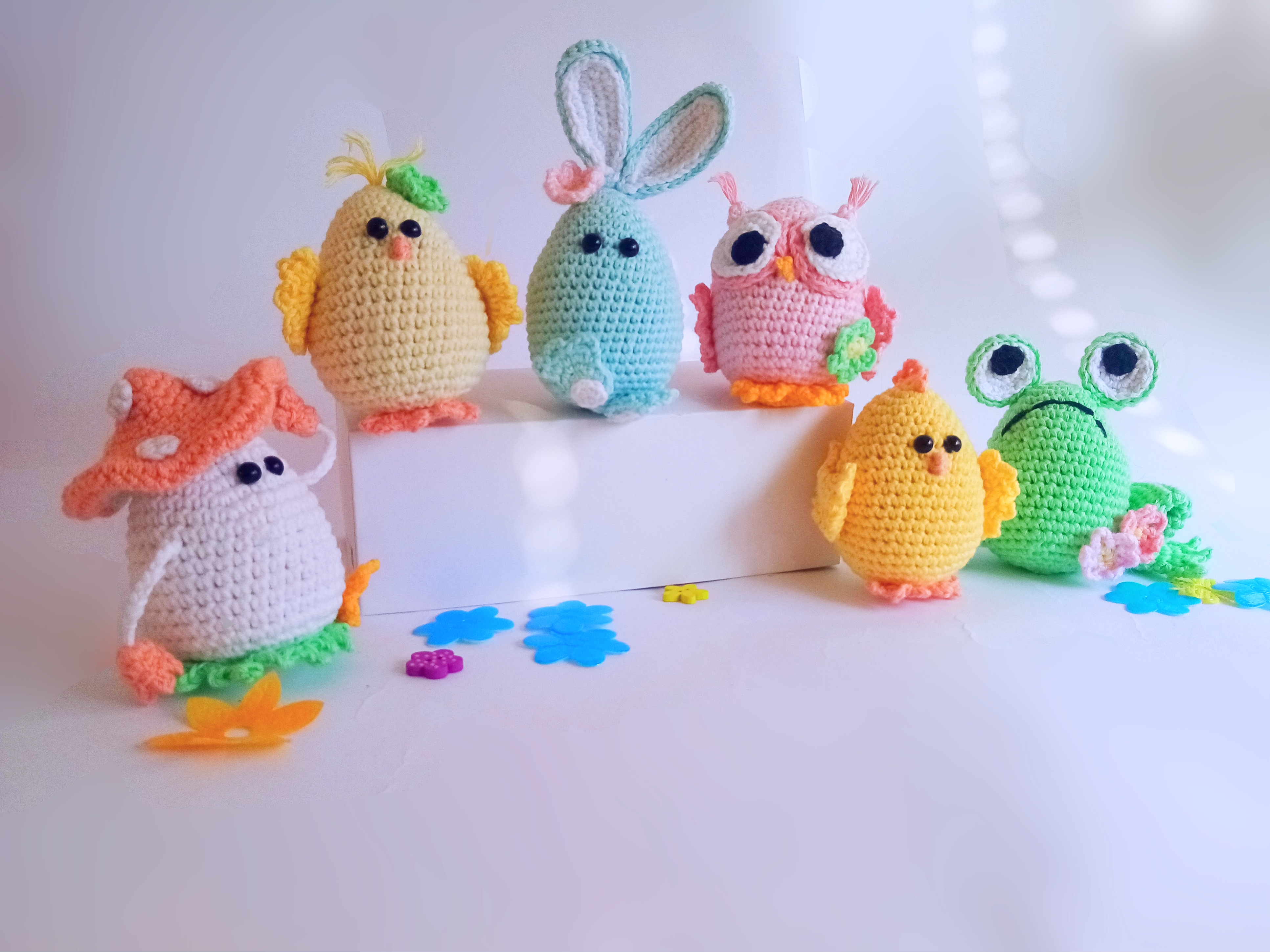 3 Ostertiere schauen neugierig aus den bunten Eiern heraus: Lämmchen, Osterhase und Küken werden aus einem dünnen Flauschgarn gehäkelt. Das wird anschließend etwas aufgebürstet, so dass die flaumige Oberfläche entsteht. Die Beschreibung für das deckchen gehört ebenfalls zur Anleitung.