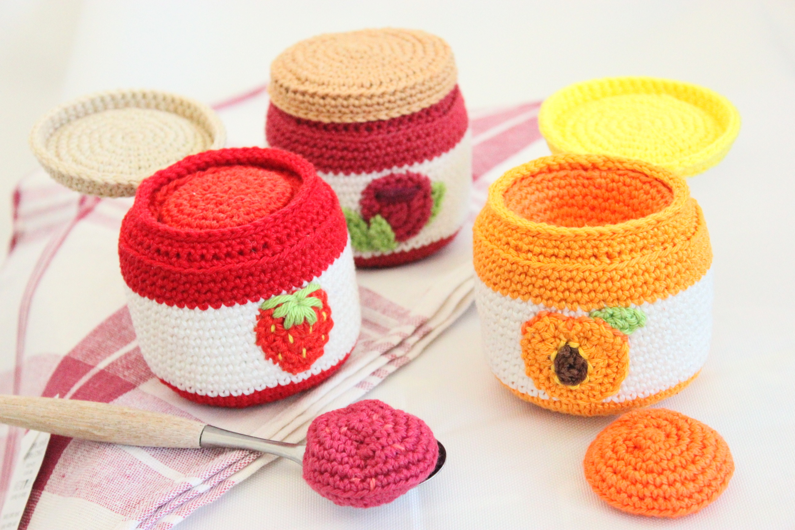 Ein Marmeladenglas mit Deckel, der sich öffnen und schliessen lässt. Dazu ist im Inneren Platz für eine kleine Portion Marmelade zum Entnehmen. Die Anleitung enthält die Sorten Himbeer, Erdbeer und Aprikose. Auch für Anfänger geeignet und perfekt, um Wollreste zu verbrauchen :-)