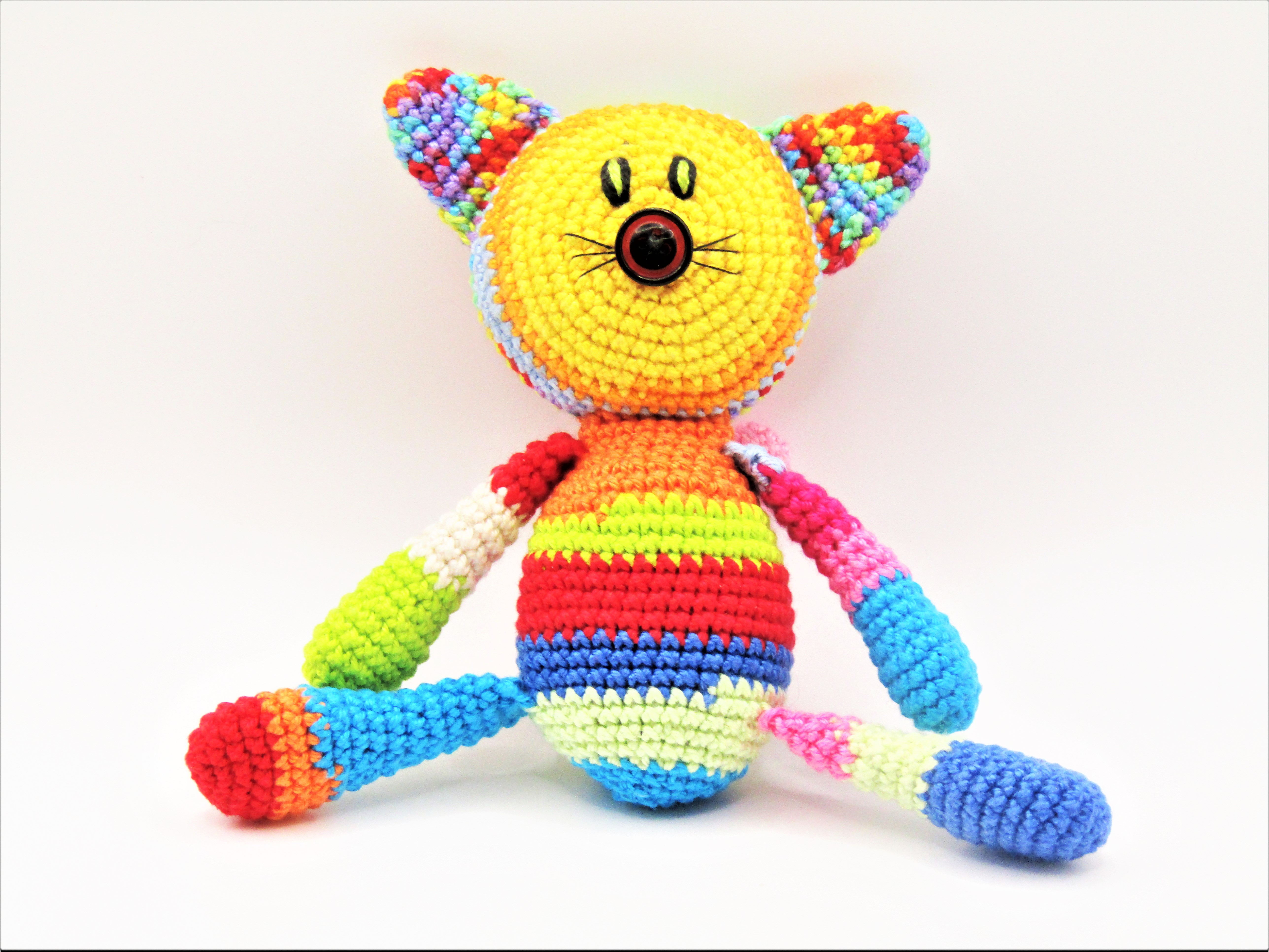 Wer von euch, kennt das nicht? Baumwollgarnreste und Wollreste, ohne Ende. Und keine Idee, was man damit anfangen soll. So entstand die Bunte Schmusekatze für kleine Kinder, besonders reißfest! Da die Ohren, Beine und der Schwanz angehäkelt werden. Die Katze ist kindlich gestaltet, um die Kleinsten damit anzusprechen. Je bunter, desto besser!