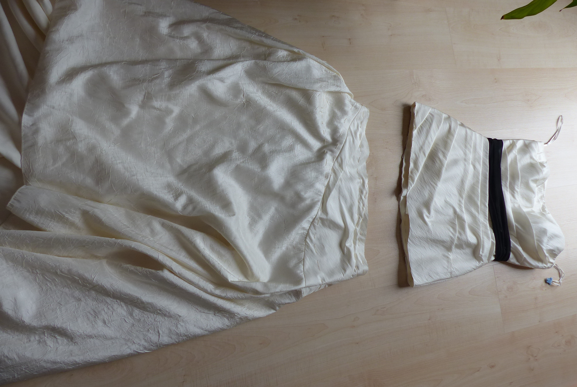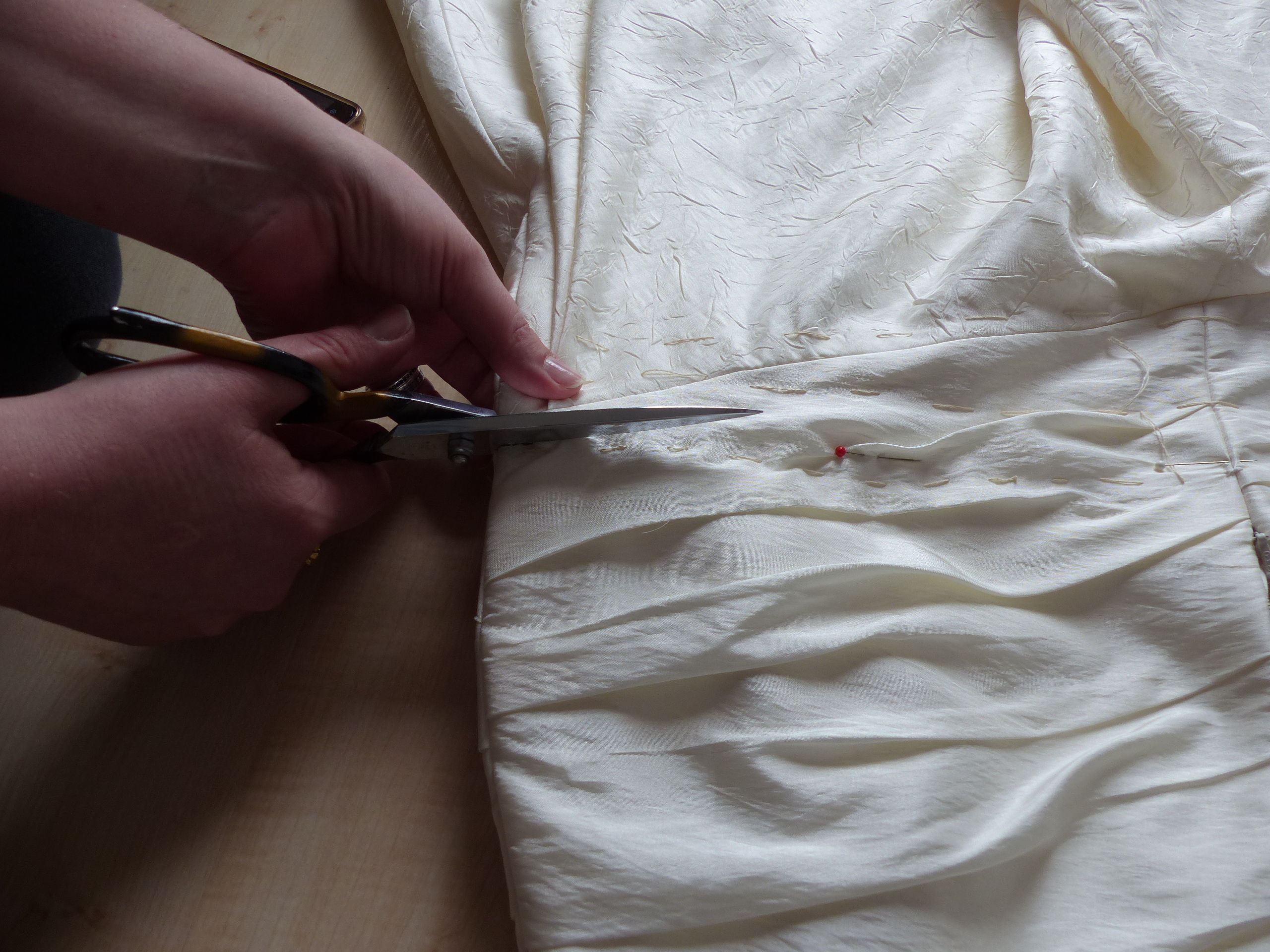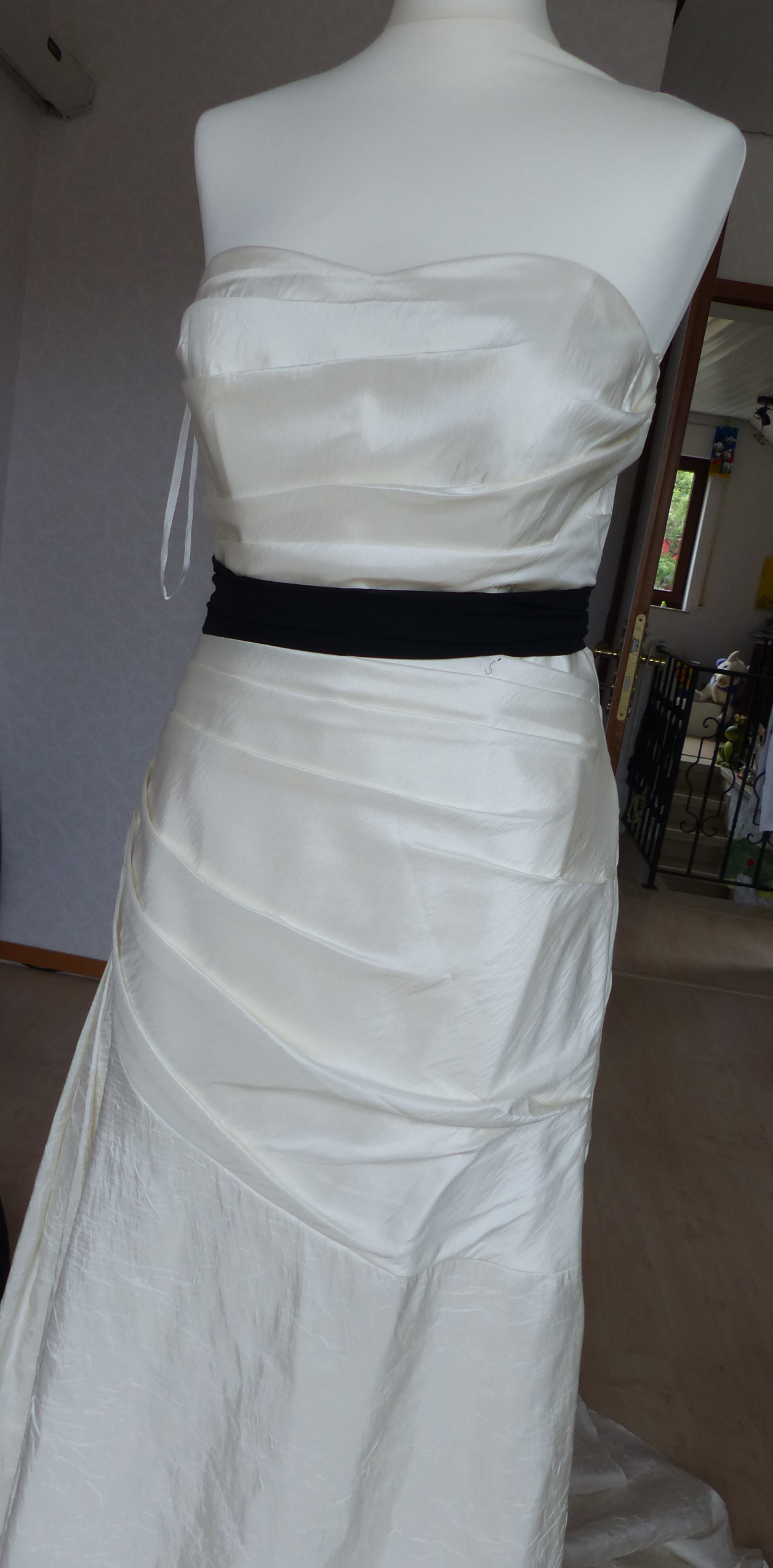 Aber wie? 3 Lagen Stoff, welche dann am Ende ja wieder aufeinander liegen müssen. So kam ich auf die Idee, ich ziehe das Kleid meiner Schneiderpuppe an. Sie hat Größe 34/36, meine Tochter hat eher an der Hochzeit Größe 40 - und siehe da, der Schneiderpuppe passte das Kleid. Was war meine Tochter happy, das Kleid war bei der Reinigung eingelaufen, nicht sie hatte zuviel zugenommen.