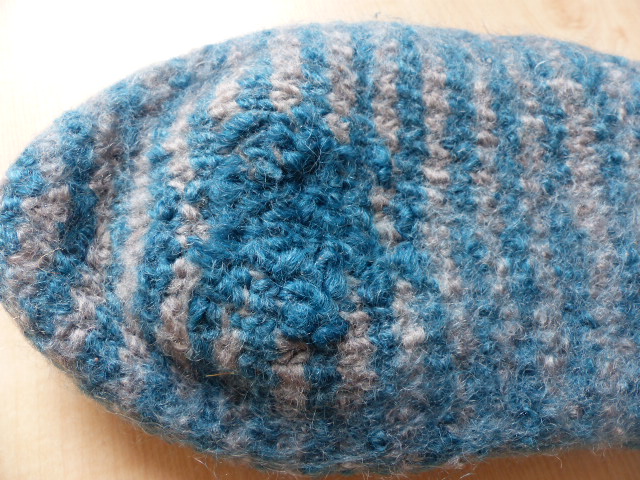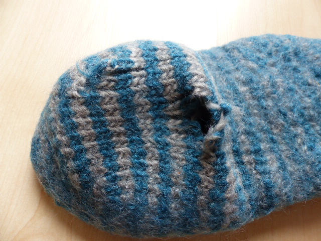 Bei meinen Filzschuhen nähe ich immer Ledersohlen drunter. Damit halten sie 4 x länger als ohne. Und das Leder bekommt der Zeh so schnell nicht durch. Das ist zwar einmal Aufwand, aber man hat seine Filzies dann halt länger. Für die Ledersohlen verwende ich ausgediente Lederjacken. Die ergeben zig Paar Ledersohlen. "Gelocht" werden sie bei mir auch mit der Zange.