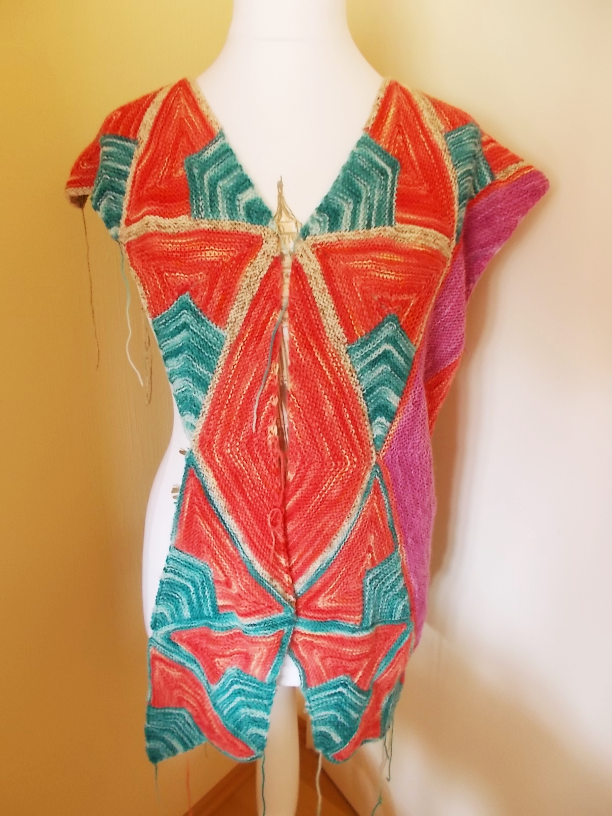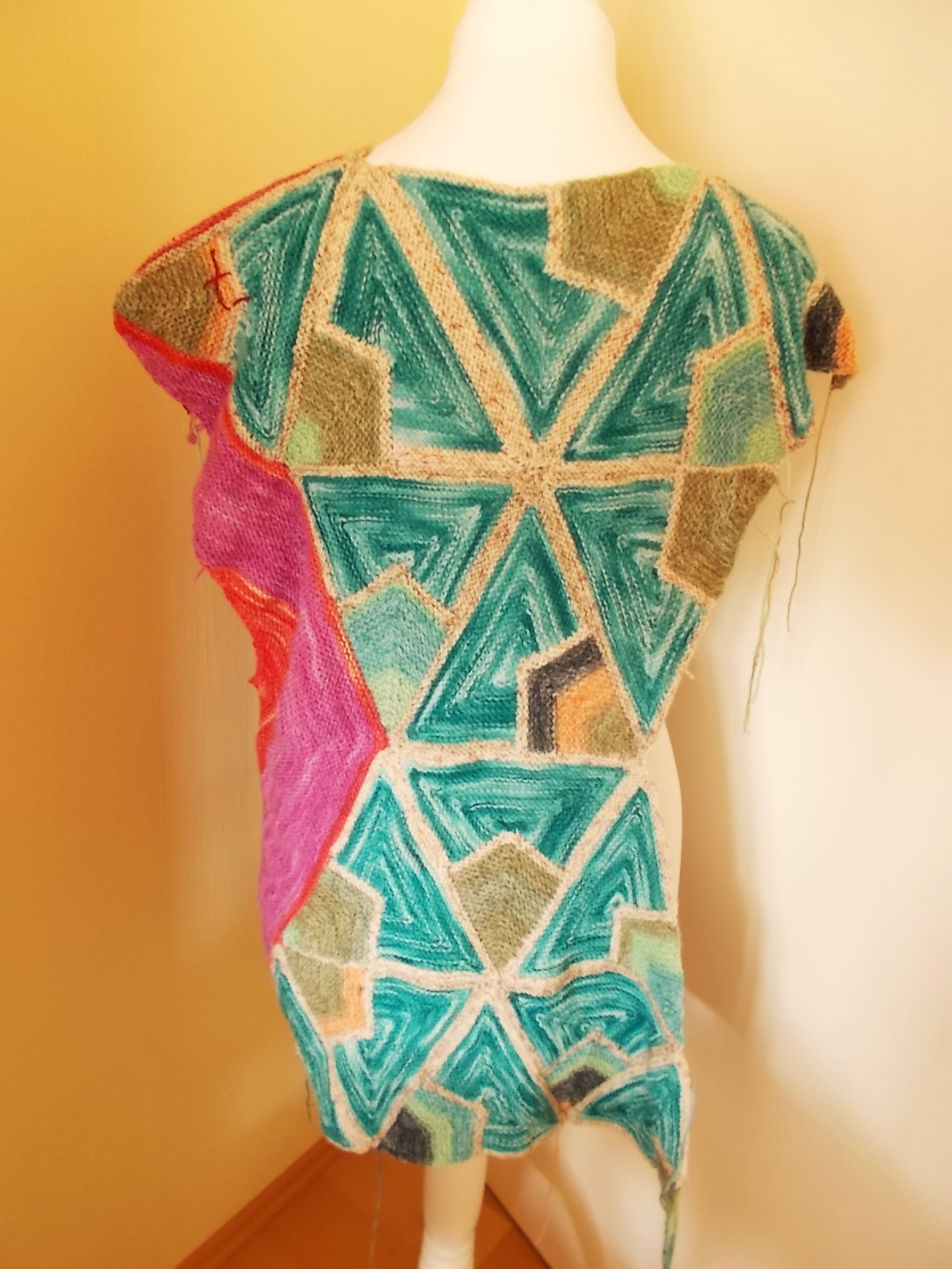 Was mich allerdings wieder mal total fesselt, ist der neue Karlos. Inzwischen bin ich damit schon ziemlich weit gekommen. Er lässt mich einfach nicht mehr los. Dabei sollte es mehr ein "Nebenbei"-Projekt werden. Jetzt könnt ihr auch die anderen Farben und Kombinationen mit der handgefärbten Sockenwolle sehen - rot ist vorne dabei. An den Seiten ist die Hauptfarbe lila.