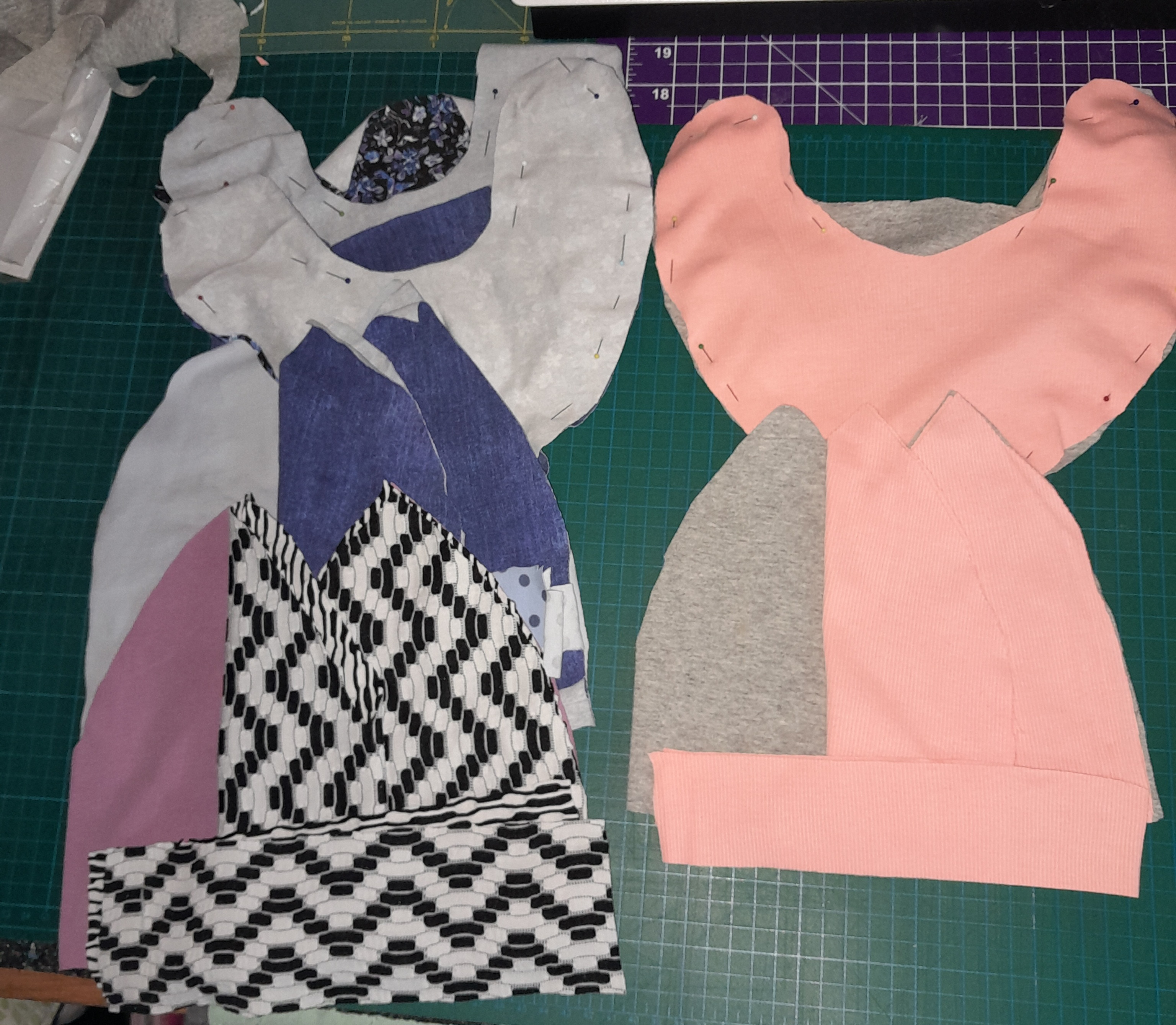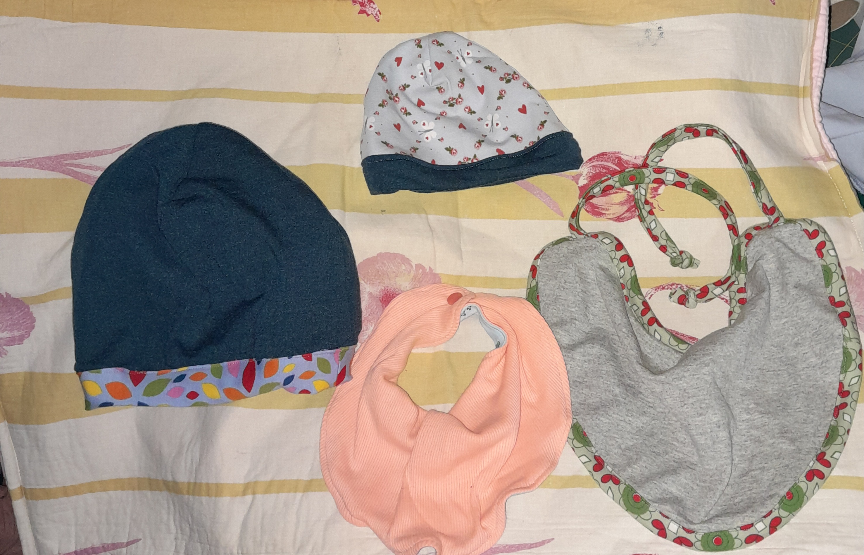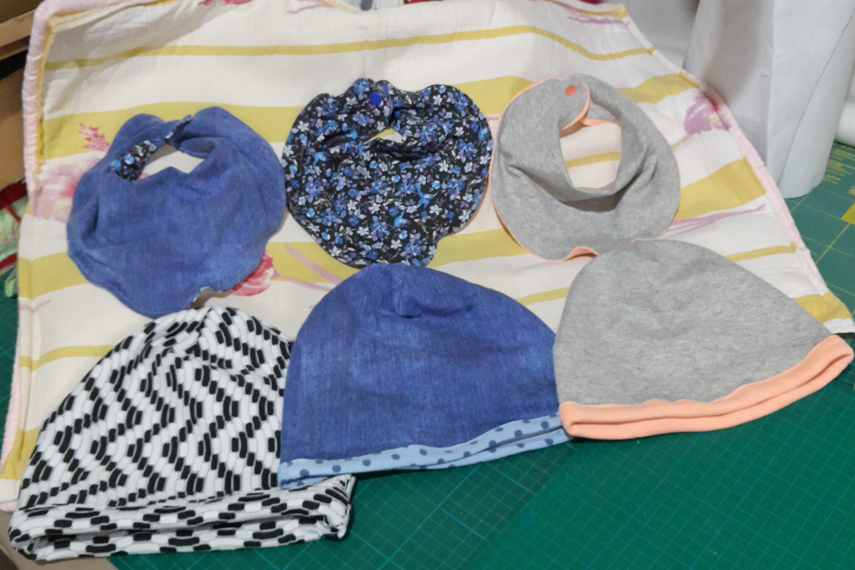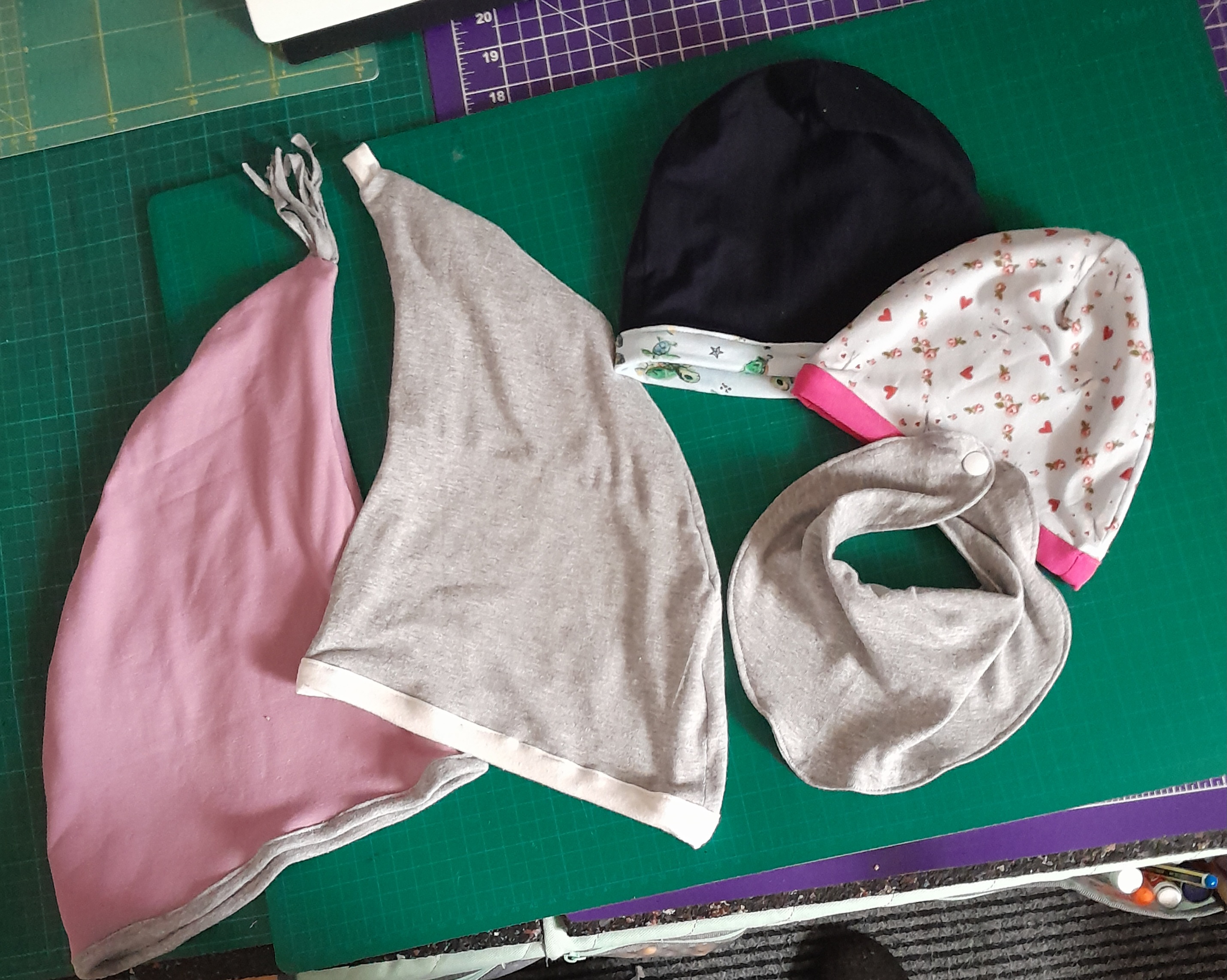 so die Teile sind genäht, 3 Mützle und 3 Schallätzle