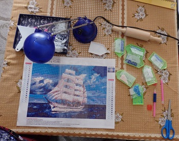 das sind die Steinchen, die Schale zum Steinchenaufnehmen, sowie der Stift und das Wachsplättchen