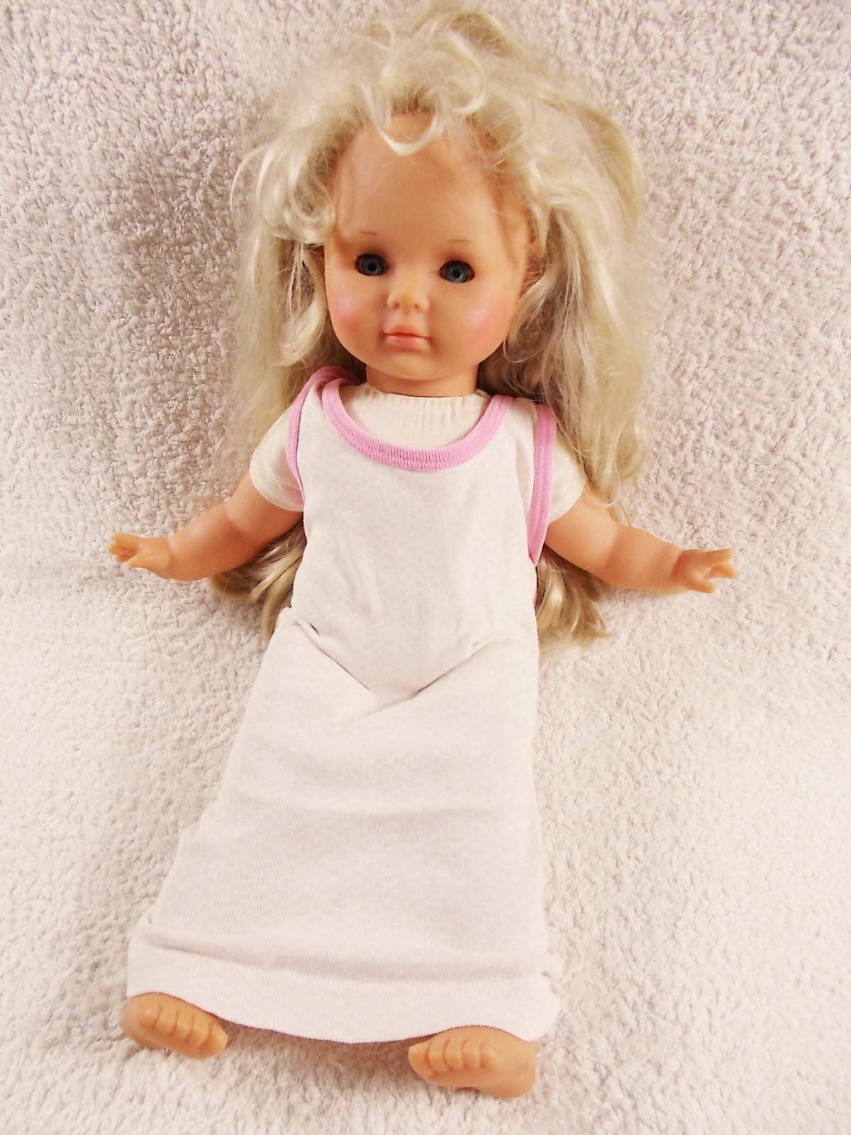 meine 43-jährige Nichte hat mir eins ihrer Puppenkinder geschenkt. Sie dürfte an die 40 Jahre alt sein, ist ca. 50 cm groß und hat wunderschöne lange Haare. Ich finde, sie sieht aus wie ein Engel mit ihren hübschen blauen Augen. Sie wurde freudig begrüßt, adoptiert und hat jetzt den Namen Sophie.