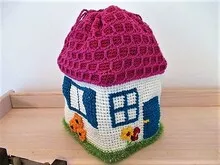Aufbewahrungsbeutel Spielhaus kann man sehr gut nebenbei beim Fernsehen oder Kaffeeklatsch häkeln, denn es geht einfach immer nur rundherum. Fenster und Tür werden hinterher aufgestickt, die Blumen extra gehäkelt und dann angenäht. Der Spielebeutel bietet Platz für kleine Bausteine. Modellautos, Püppchen oder CDs.