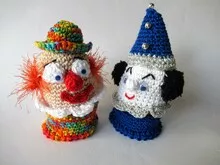 Für die Clown-Eierwärmer kannst du viele bunte Reste verwenden: links siehst du den Dummen August und rechts den vornehmen Weißclown, der alles immer besser weiß.Die passenden Eierbecher dazu sind auch schnell gehäkelt.