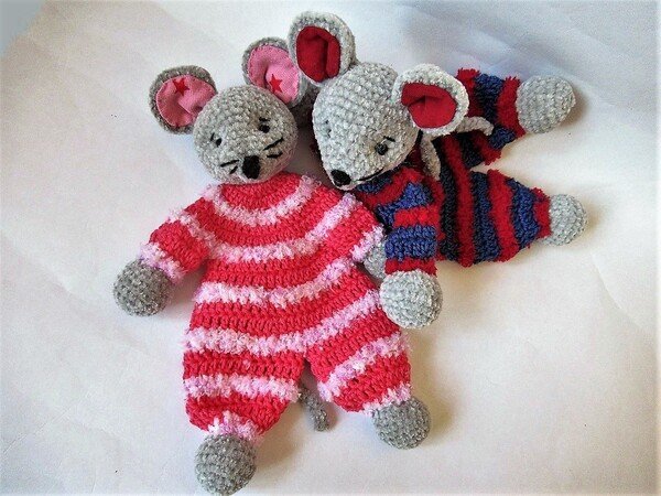 Sind die beiden Kuschelmäuse nicht süß? Diese Maus (in Pastell oder in kräftigen Farben, je nachdem, was deine Wollvorräte hergebeben) wird mit drei unterschiedlichen Garnarten gehäkelt: Kopf, Pfoten und Schwanz mit weichem Chenillegarn und der Körper mit Baumwolle und Plüschgarn. Dadurch entsteht eine ganz besondere Struktur, die den Tastsinn des Babys anregt. Damit es sein Mäuschen auch gut greifen kann, wird der Körper nicht ausgestopft. Und die Augen sind natürlich aufgestickt, damit nichts verschluckt werden kann!