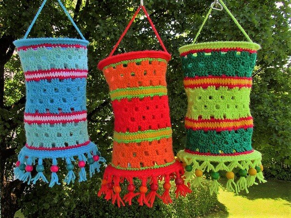 Diese gehäkelten Lampions sehen nicht nur im Sommer auf der Terrasse toll aus, sondern können auch als Laternen für den Martinsumzug verwendet werden. Du kannst sie aus bunten Wollresten häkeln. Für 1 Laterne brauchst du insgesamt etwa 60 g. Innen wird eine LED-Lichterkette befestigt, dann leuchtet die Laterne schön hell.