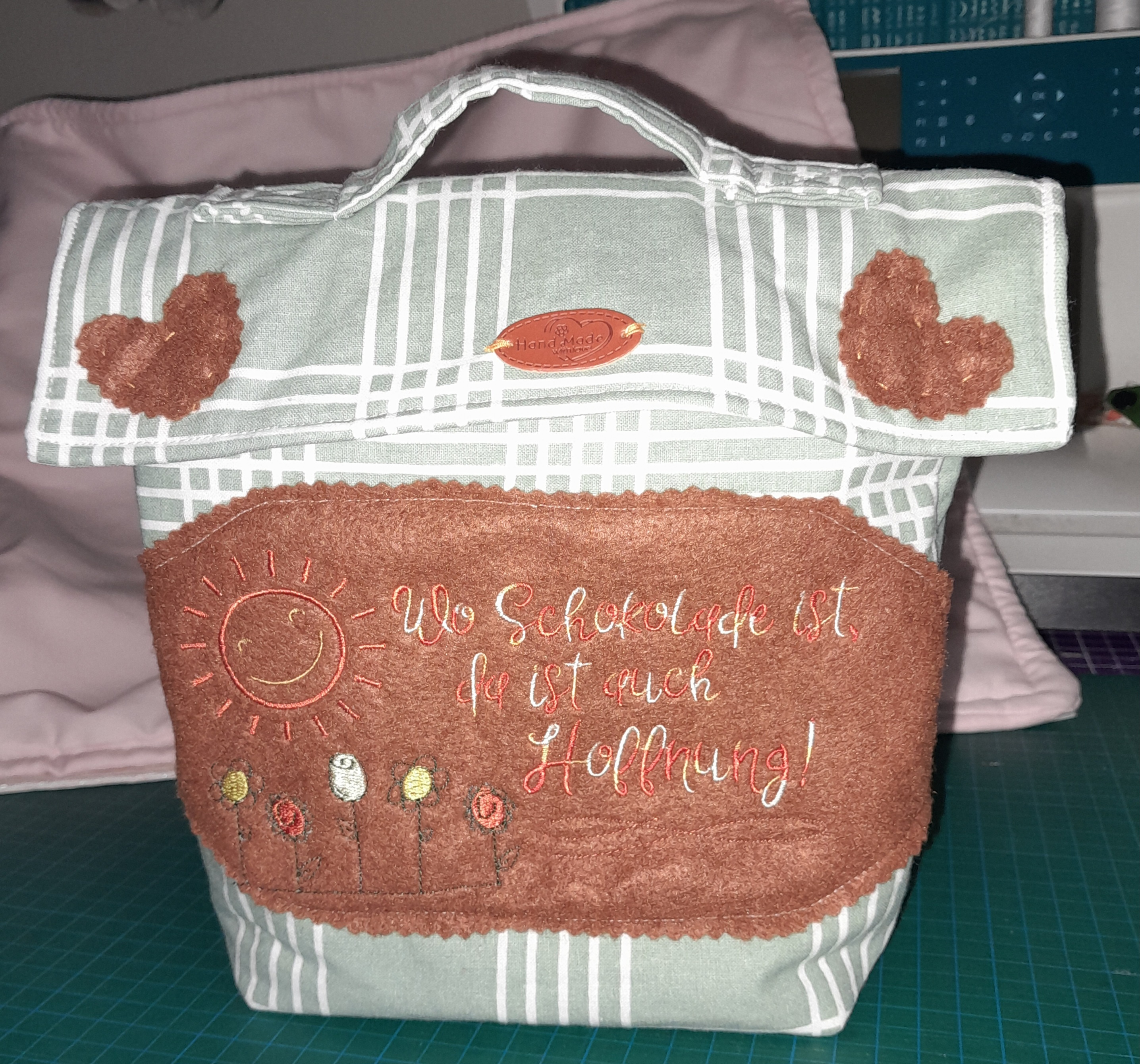 dieses Täschle hab ich heute Nachmittag entworfen und genäht, der Spruch ist mal aus dem www und schon ewig auf meiner Platte. Es ist für meine Schwester zu ihrem Geburtstag. Das Täschle wird noch mit ihrer Lieblingsschoki gefüllt, denn sie liebt Schokolade sehr, ganz im Gegensatz zu mir :-)