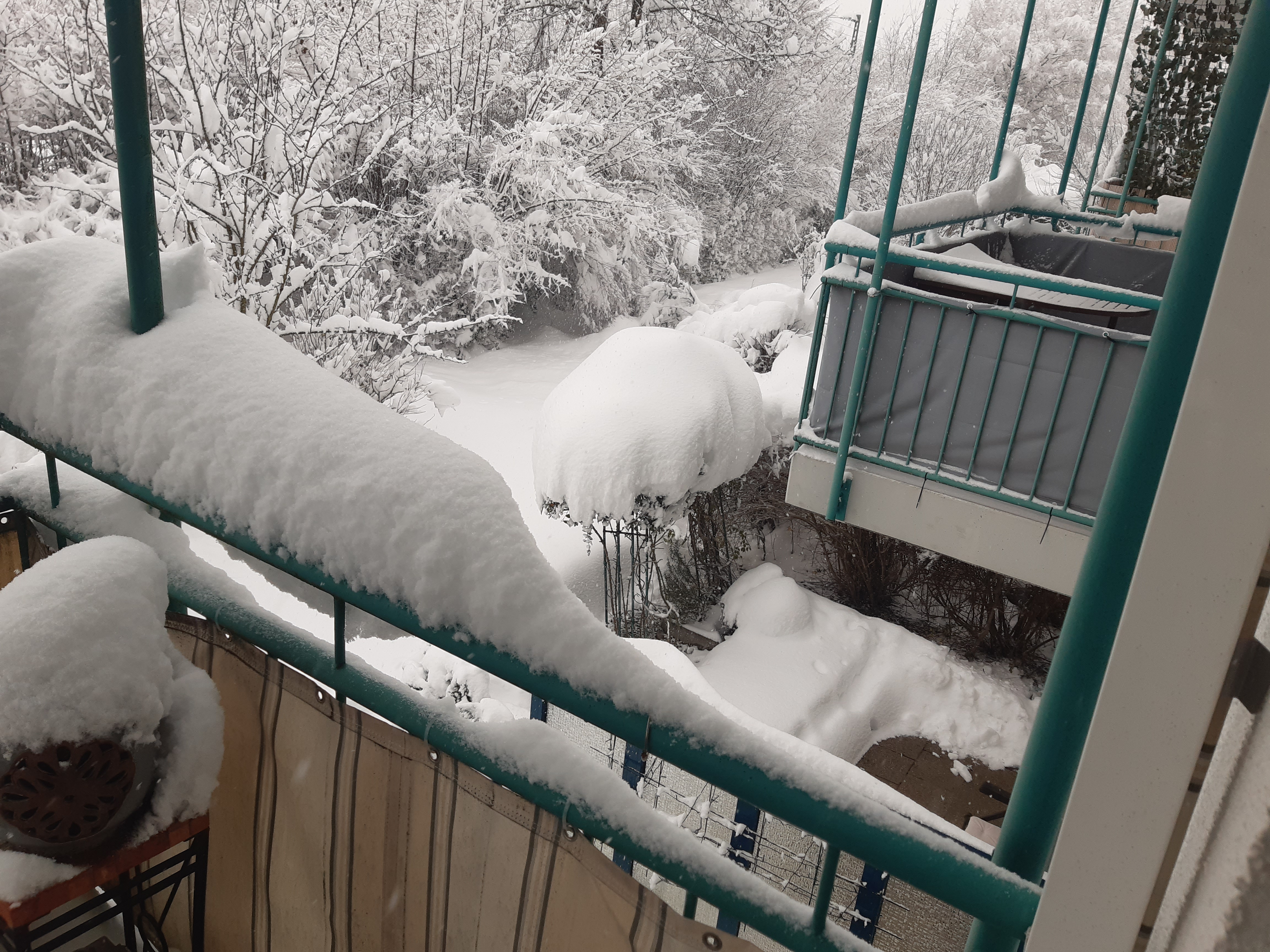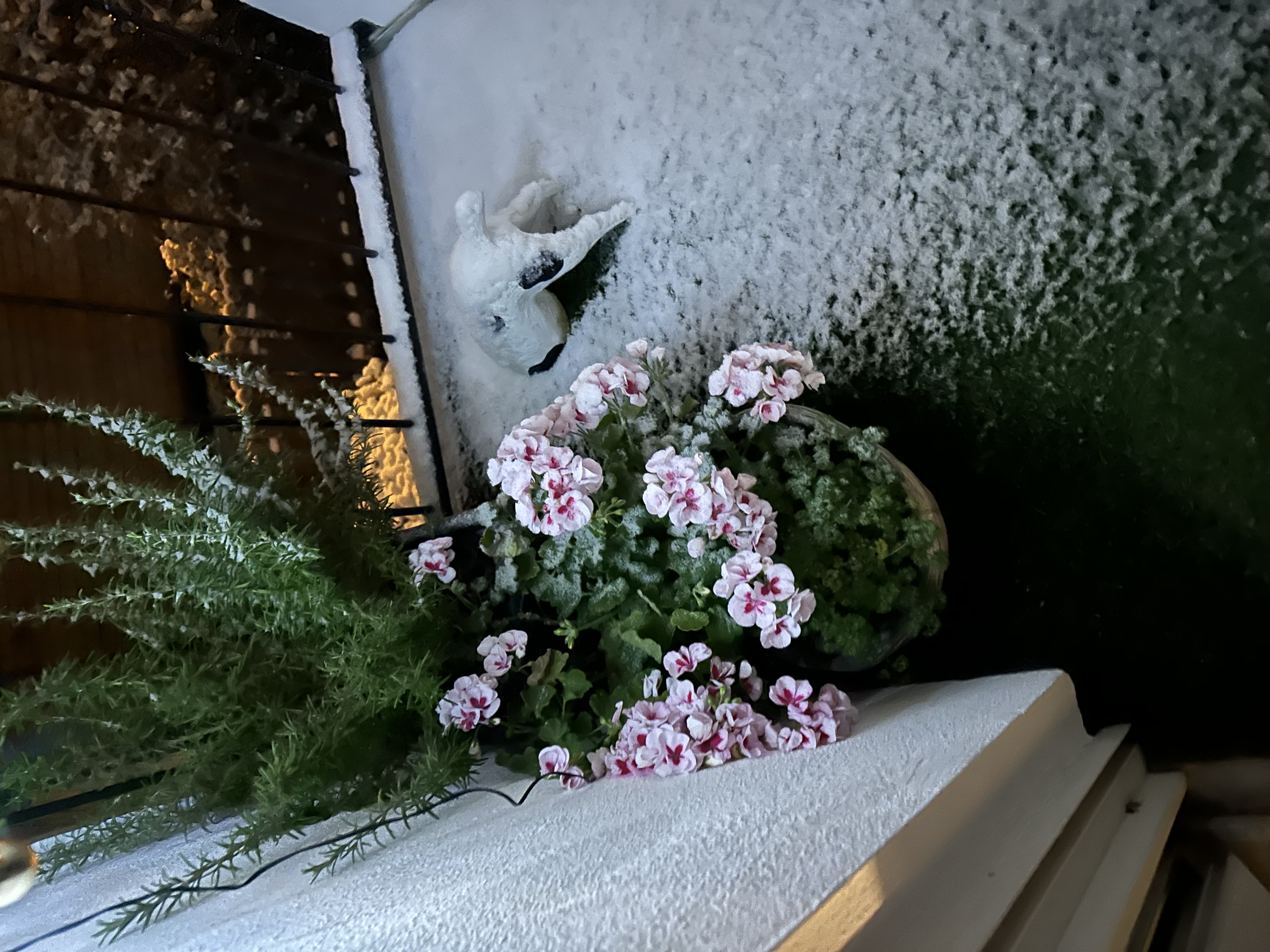 Mengenmäßig könne wir da nicht mithalten, aber immerhin hat es tatsächlich auch in Köln etwas geschneit, das ist schon sensationell genug. Und meine Geranien mögen es auch!