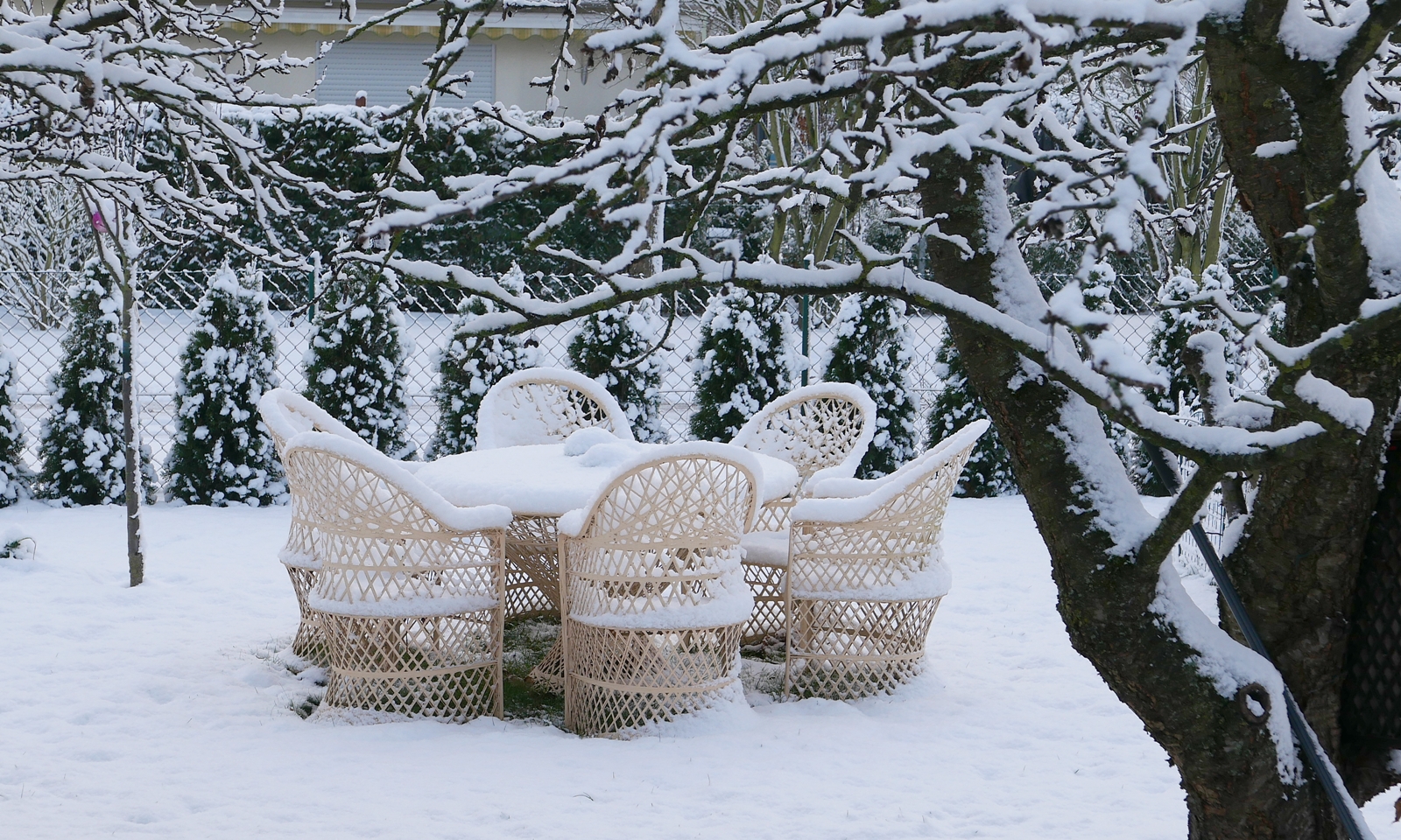 Und zu guter Letzt ein Blick auf meine winterfeste Sitzgruppe im Garten. Die Tischdeko ist ganz unterm Schnee verschwunden.