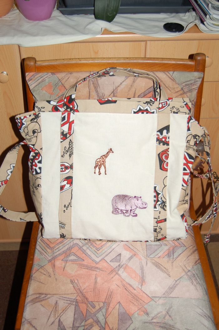 Veronika und das nähte ich damals aus dem Afrikastoff, meine Sticki kam auch zum Einsatz denn ohne die Tierwelt Afrikas war die Tasche in meinen Augen ned komplett, hier sind beide Seiten der Tasche zu sehen