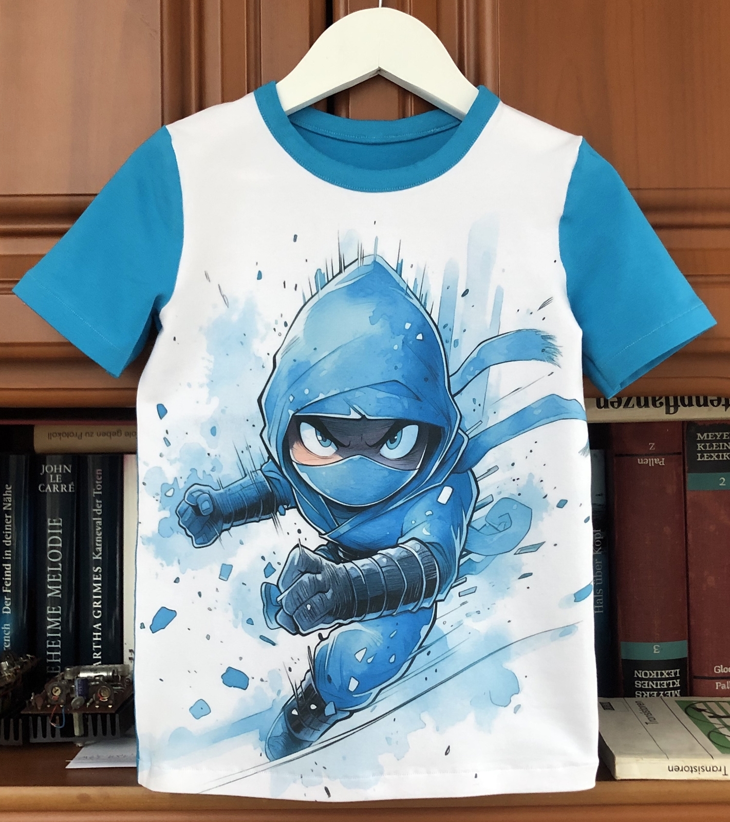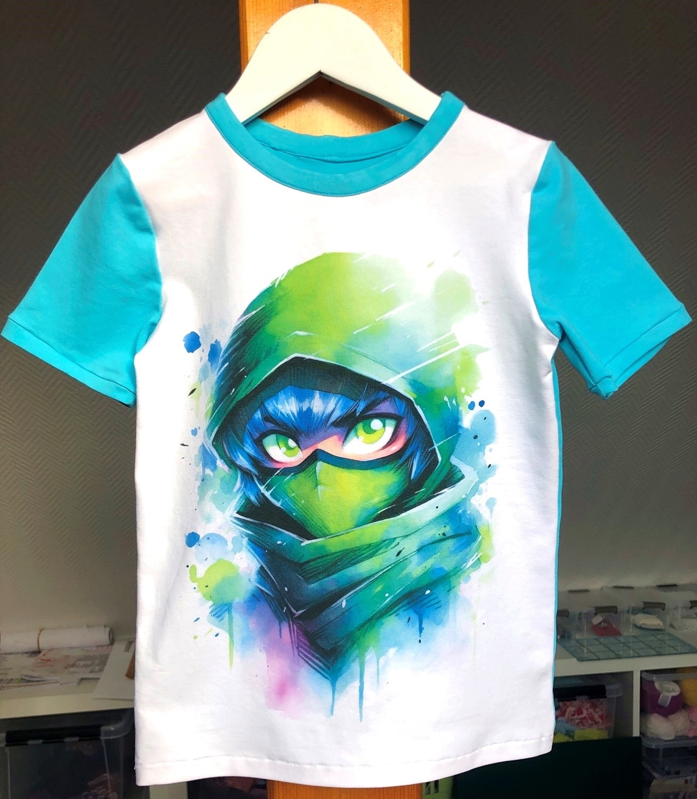 mein kleiner Enkel ist derzeit ganz versessen auf Ninja-Motive. Ich habe im Internet bei etsy zwei schöne farbenfrohe Motive gefunden, die ich nun zu T-Shirts für ihn vernäht habe. Als Kombistoff für den Rücken, die Arme und das Halsbündchen habe ich einen jeweils farblich passenden Baumwolljerseystoff gewählt.
