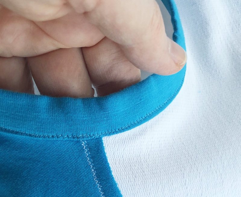 Bei den beiden Shirts habe ich etwas Neues ausprobiert. Es geht um das Halsbündchen. Da ich keine Overlock-Nähmaschine habe, hatte ich bislang immer eine abgeschnittene Stoffkante im Nacken. Das sah immer so unsauber aus.