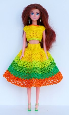 Das 2-teilige Set besteht aus einem weiten Volahtrock und einem passenden kurzen Top. Beide Sachen werden gehäkelt und hinten mit einem Druckknopf geschlossen. Die Länge des Rockes ist variabel. Dieses Modell ist wunderbar für kleine Garnreste geeignet, da man nur ganz wenig Garn benötigt.