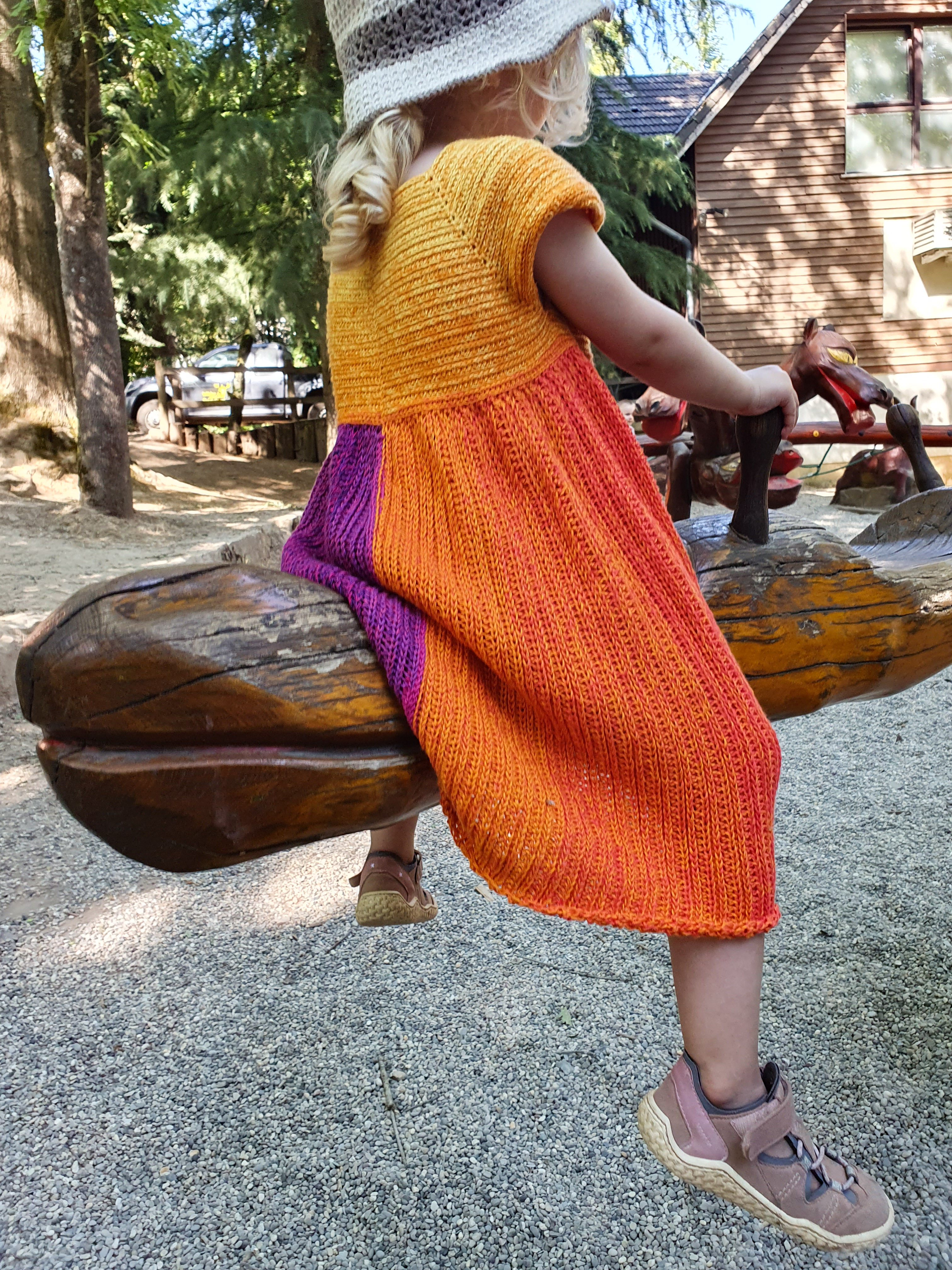 Das Streifenkleid mit Fellsaum ist genau richtig für einen Spaziergang in der Frühlingssonne. Dazu gibt es ein keckes Hütchen und eine Handtasche zum Umhängen. Und wenn es kühl wird, legt sich das Püppchen ein kuscheliges Fellcape um die Schultern.