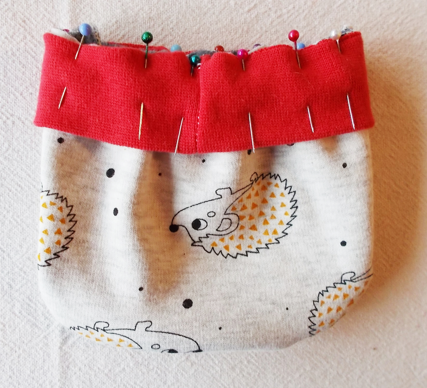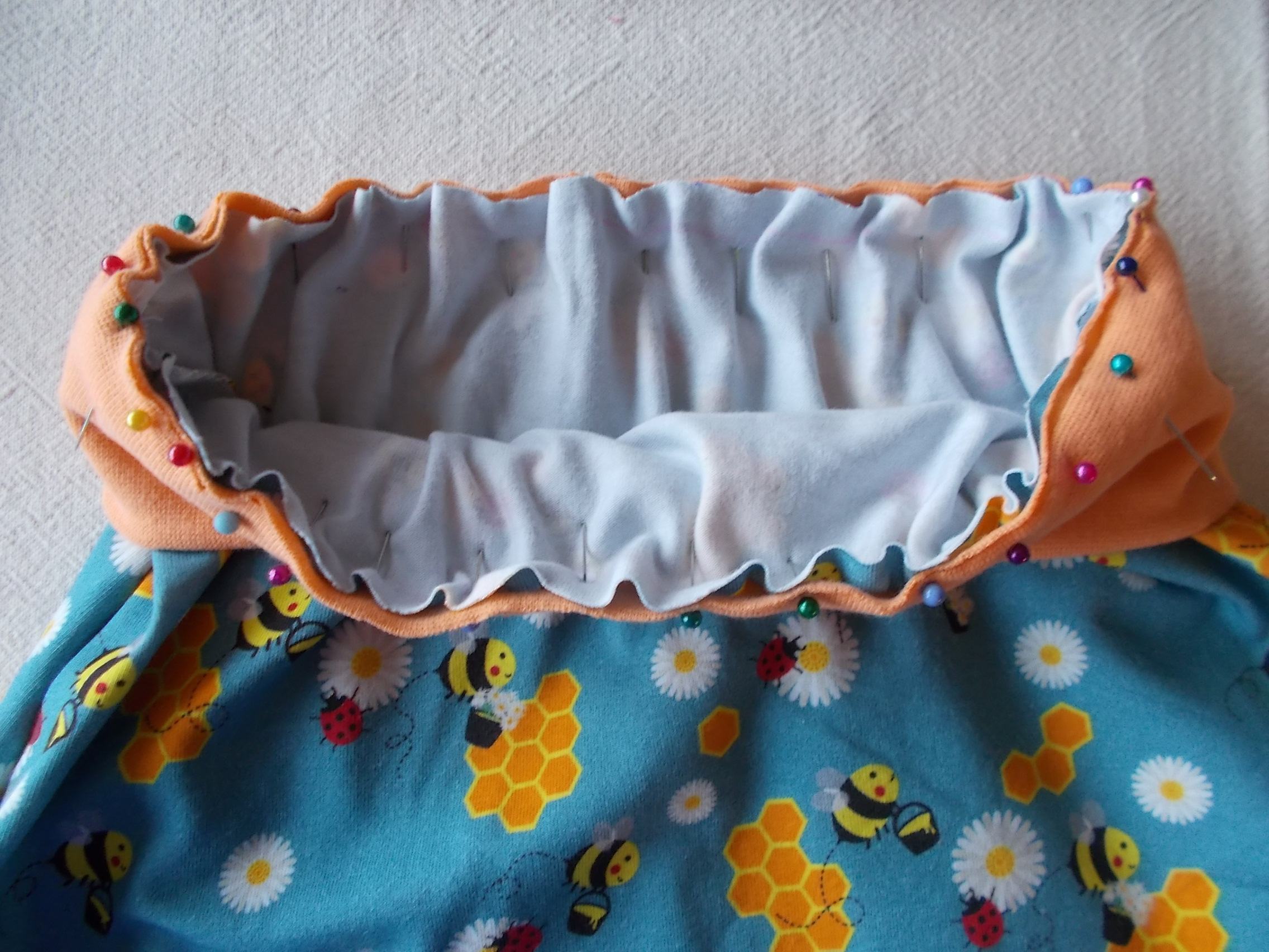 Vorher steckte ich in jede Seite des Bündchens eine Stecknadel, um die Seiten zu markieren. Im Rock waren es die Seitennähte. Das Ganze sah dann so aus:
