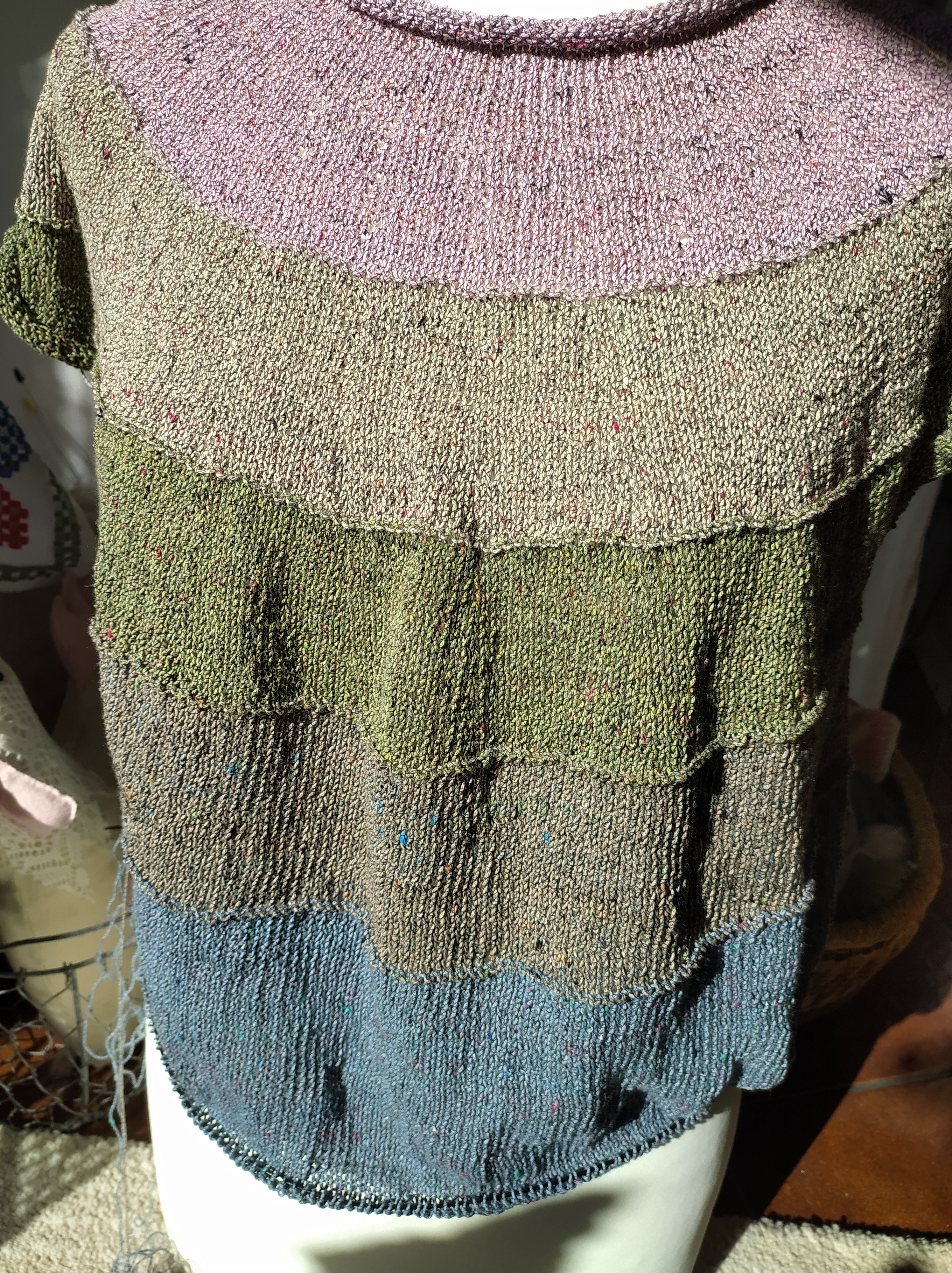 Mein Pullover ist fertig gestrickt, jetzt liegt er da und ich überlege noch, ob er mir zu weit ist oder ob ich ihn so lasse. Dazwischen ziehe ich ihn immer wieder an und dreh mich vorm Spiegel.