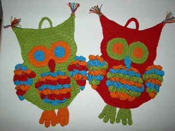 Zwei  Eulen-Topflappen in den Farben von Crazy Patterns! Diese bunten Crazy Eulen bringen Farbe und fröhlichkeut in deine Küche. Die Topflappen sind unten offen,so dass man in sie wie in einen Handschuh schlüpfen kann.Das Schuppenmuster für den Brustfleck und die Flügel wird in der Anleitung ausführlich und mit Bildern erklärt.