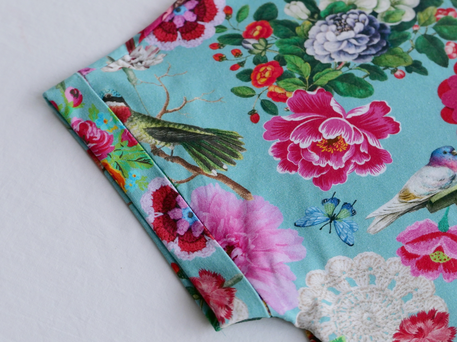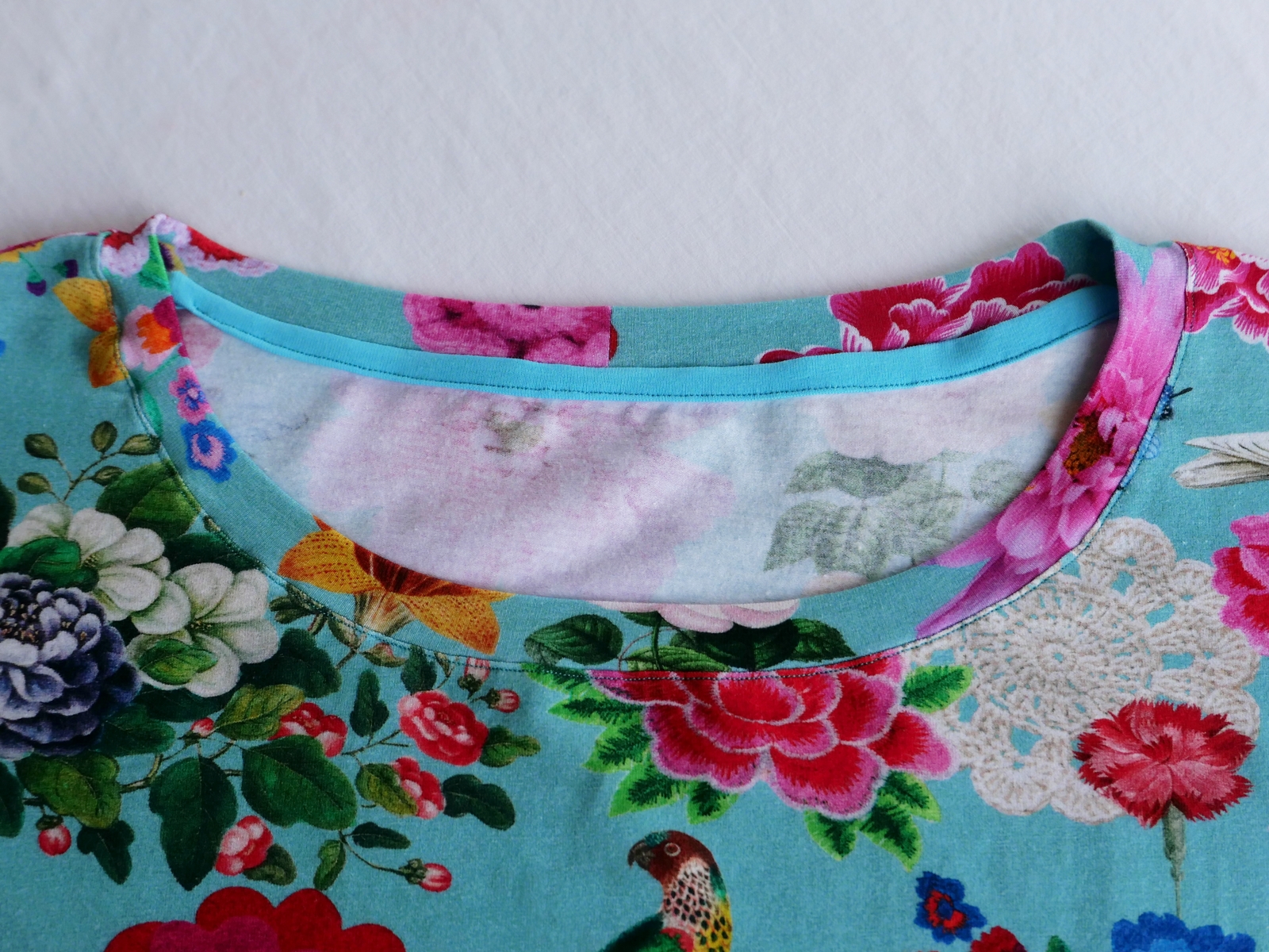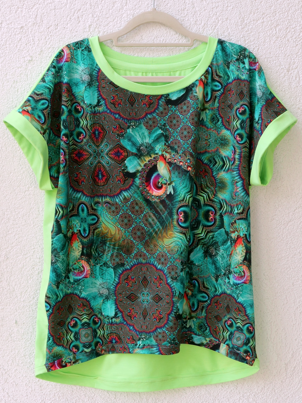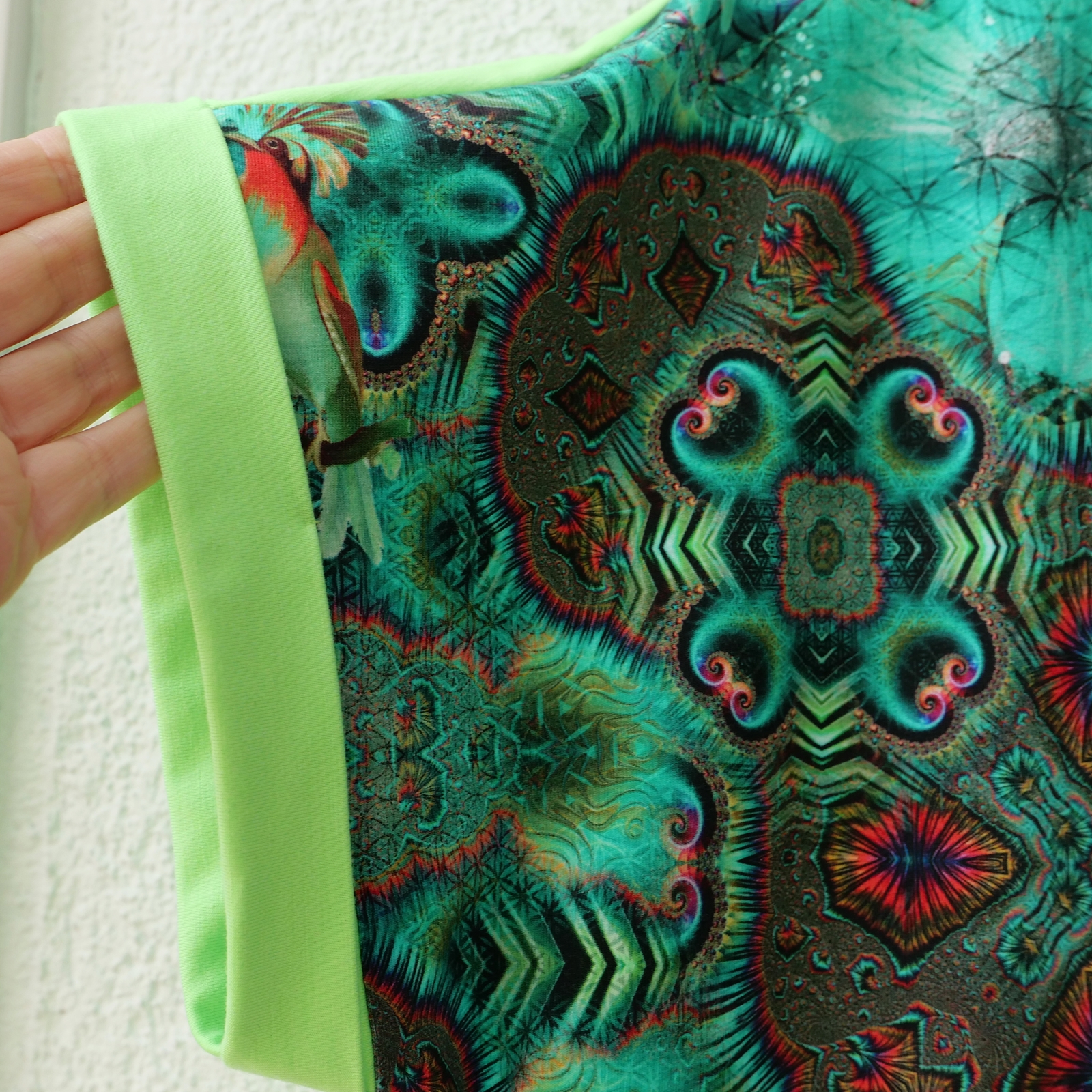 Der bunte Stoff hat mustermäßig schon viel zu bieten. Deshalb habe ich ihn mit einem einfarbigen neongrünen Jerseystoff kombiniert. So heben sich das Halsbündchen und die Ärmelumschläge auch deutlicher ab.