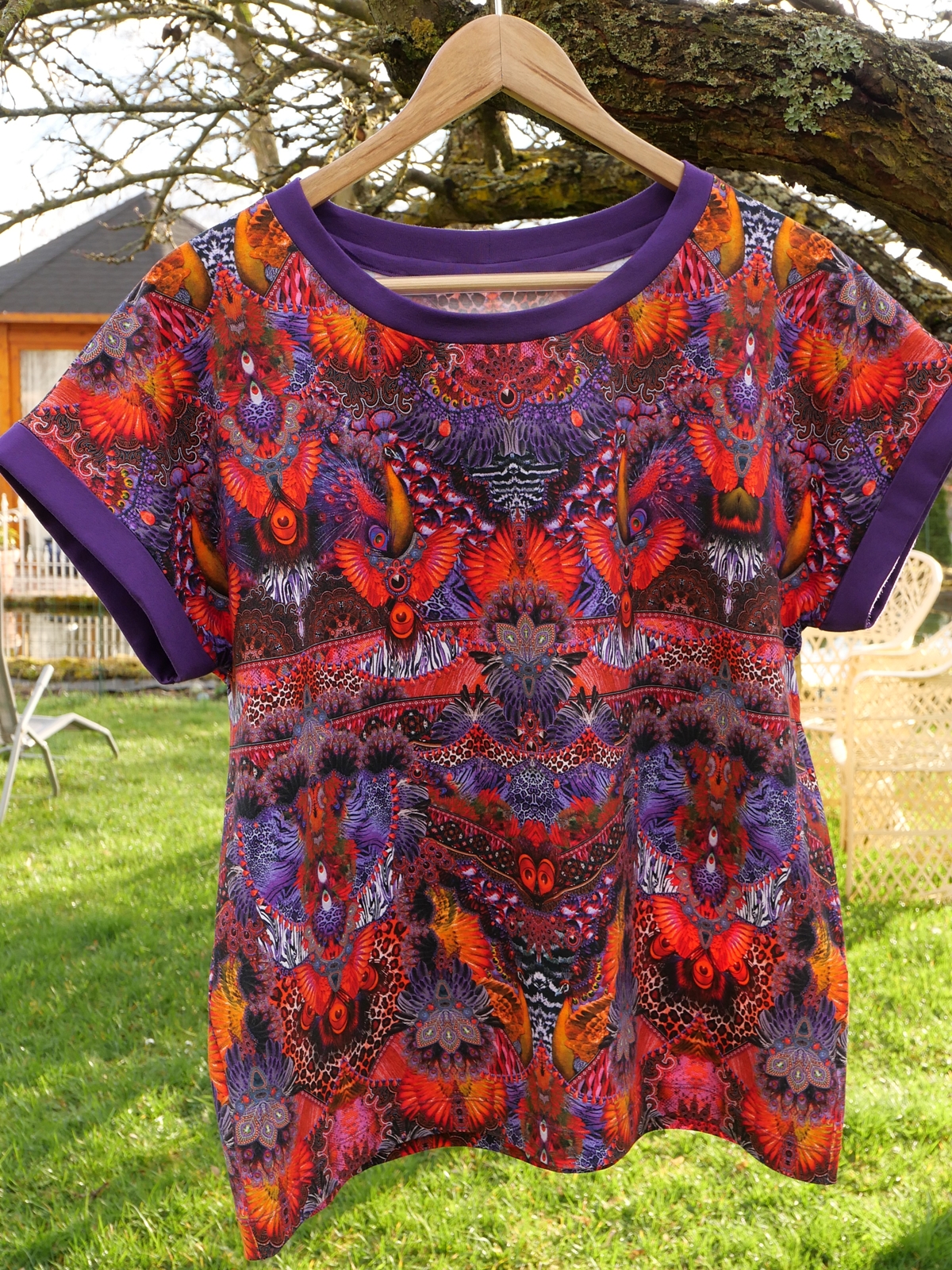 Tja, noch ein buntes Shirt dieser Art sollte folgen. Dieses Mal mit Lila abgesetzt. Hier habe ich mal einen geraden Saum unten genäht. Weil die Farben so schön leuchten, bin ich mal direkt in den Garten zum Fotografieren gegangen.