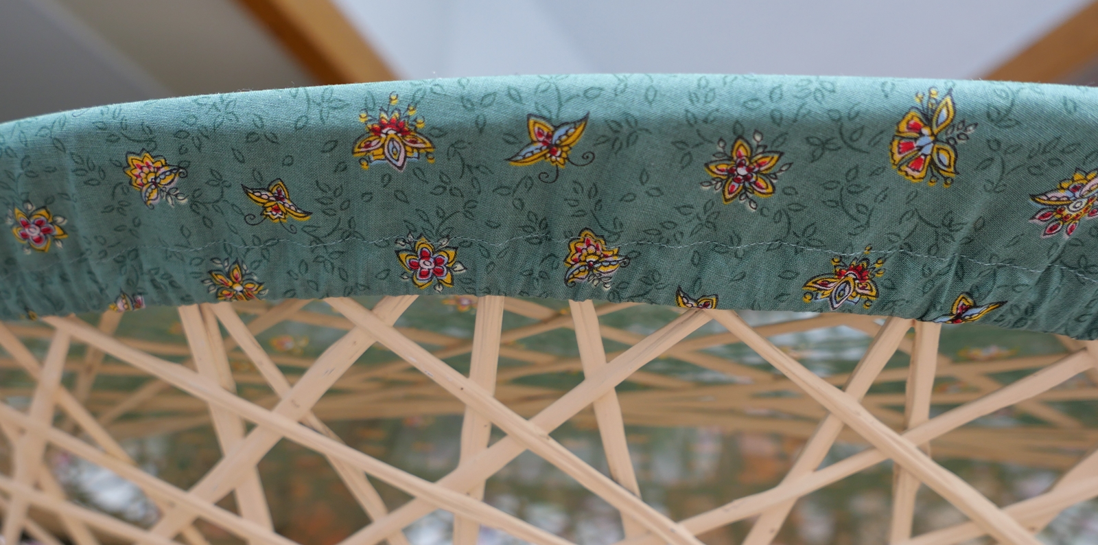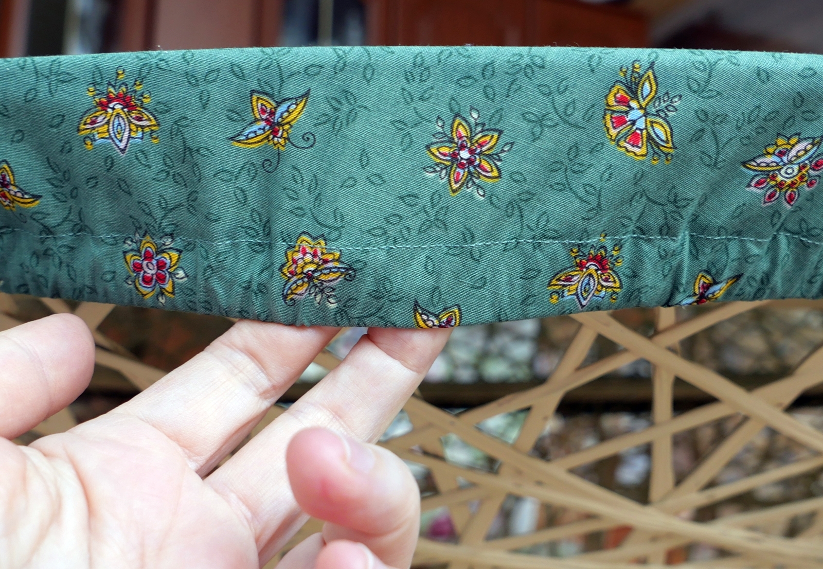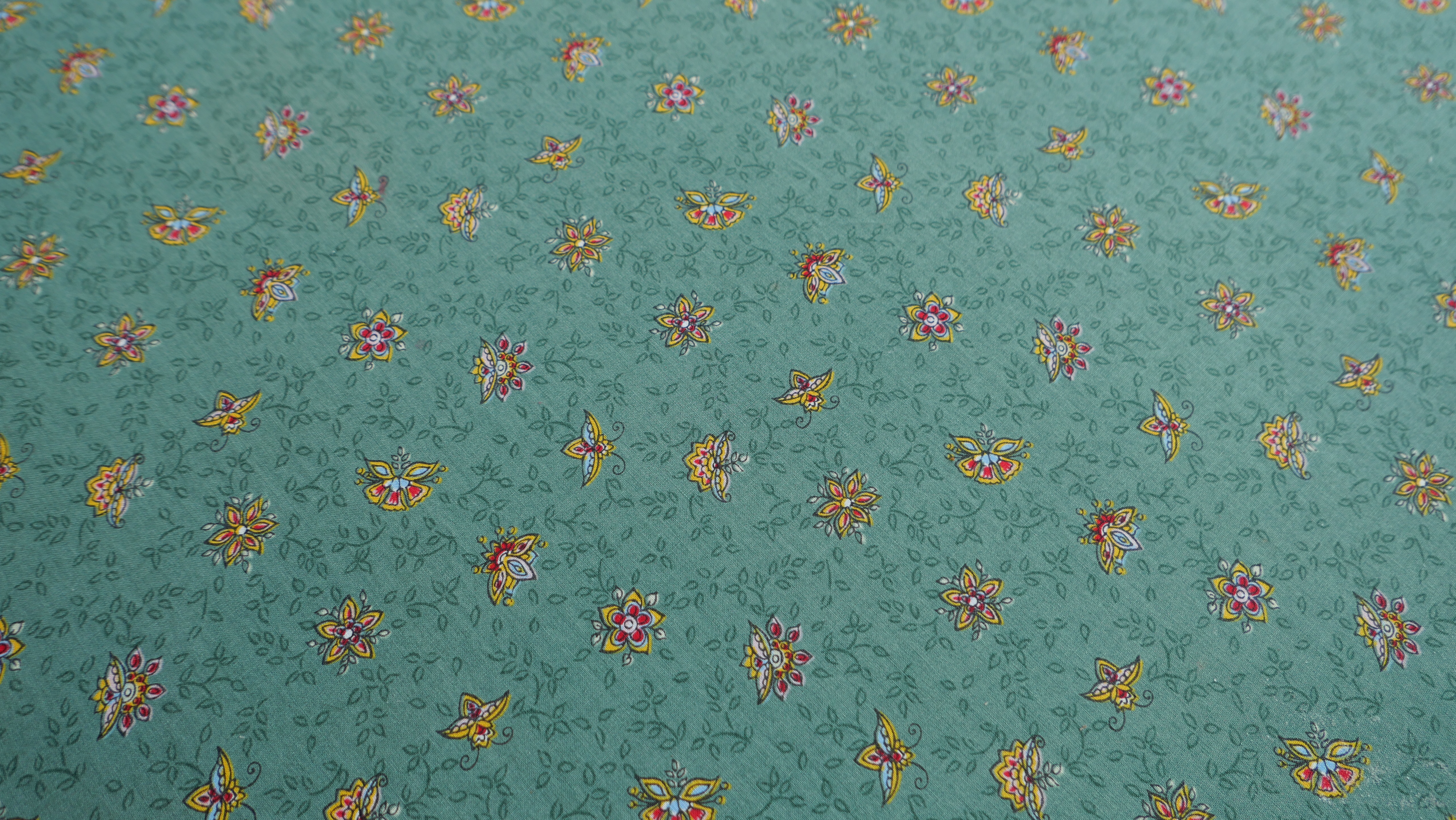 Den Baumwollstoff hatte ich früher mal in meiner Tauschbörse getauscht, einfach, weil er mir gefiel. Ein schönes Grün mit kleinen unaufdringlichen Blüten und Blättern drauf. Für irgendwas würde ich ihn schon brauchen können.