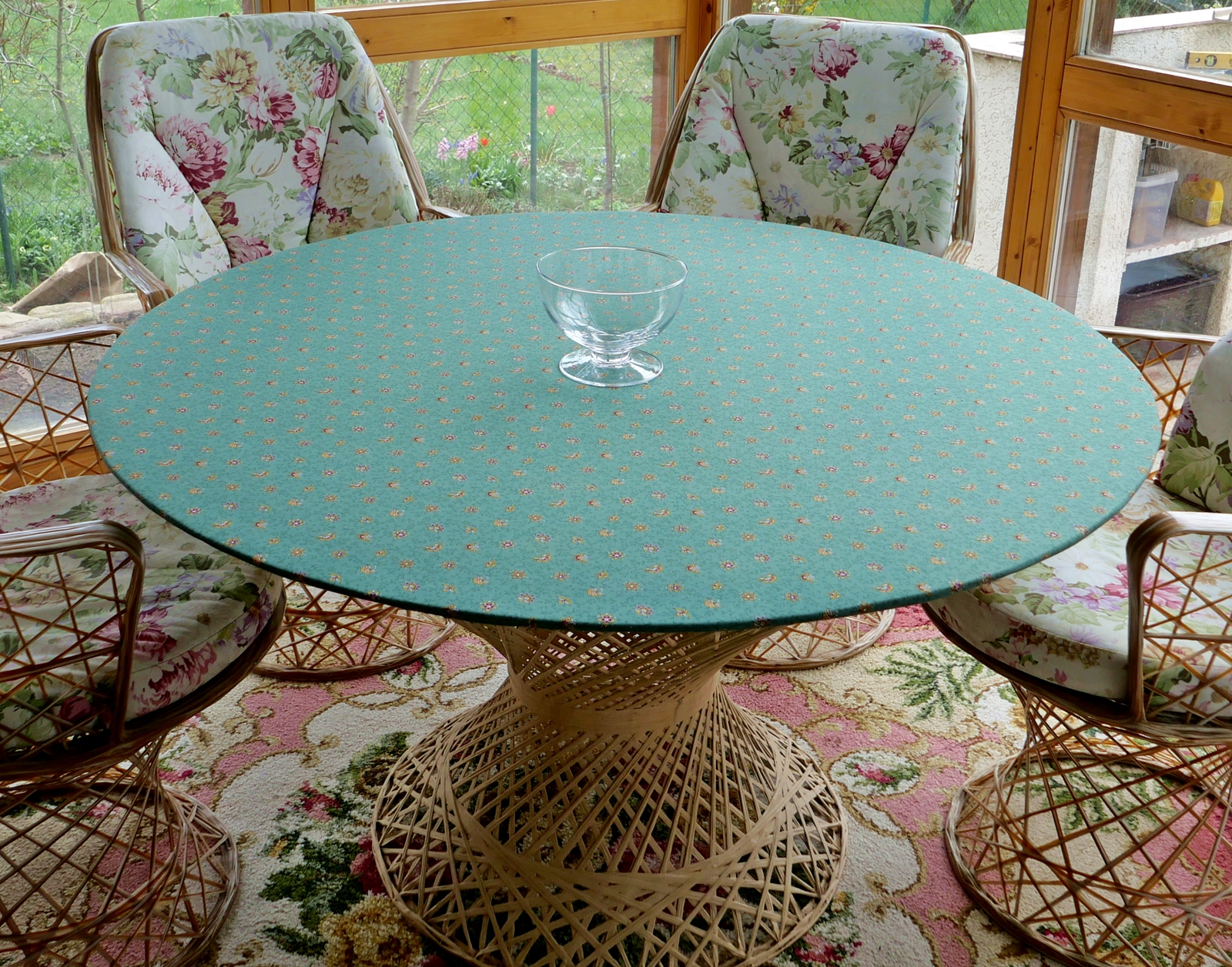 Im Vorfeld habe ich mir Gedanken über eine Tischdecke gemacht. Vorher habe ich im Internet geschaut - ja, es gibt große runde Tischdecken, aber entweder gefiel mir die Farbe, das Muster, die Qualtiät (nur Polyester grrr) oder der Preis nicht. Deshalb habe ich mir spontan am Tag vor Ostern selber eine genäht.