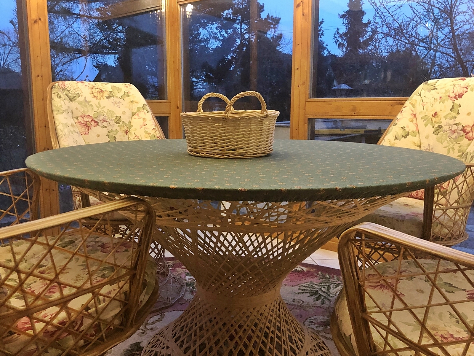 da unsere Familie größer wird, ist unser großer runder Tisch (125 cm Durchmesser) vom Garten ins Haus gezogen. An Ostern passten da 7 Leute bequem ran.