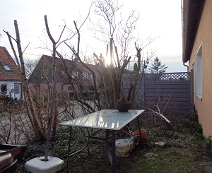 Bin froh, dass die Stümpfe noch wieder ausschlagen. So wird es etwas grün. Im Blumenbeet an der Eingangsseite haben meine Nachbarn ihre Fahrräder abgestellt. Also gibt es keine Blumen.