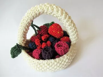 kleines Beerenkörbchen, das es ebenfalls für den Kinderkaufladen gibt. Es enthält gehäkelte Erdbeeren, Kirschen, Blaubeeren, Himbeeren, Brombeeren und Johannisbeeren.